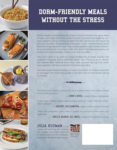Dorm-Friendly Meals Without the Stress Eating healthy while balancing a hectic school schedule has never been simpler with Julia Kuzman’s series of quick and delicious meals for college students. Using minimal, budget-friendly ingredients and requiring zero culinary skills, these recipes will provide much-needed fuel for those early morning classes and late-night study sessions. Look inside to find an array of recipes that can all be made with dorm-friendly appliances such as the microwave, blender, toaster oven and hot plate. Take your lunch to go with Go Greek! Stuffed Pita Pockets. Soothe that weekend hangover with a Walking “Dead” Taco. Whip up an A+ dinner with Better-Than-Takeout Fried Rice. Treat yourself during final exam cram sessions with some Kitchen Sink Chocolate Bark. For every busy student looking to master the basics of cooking and stick to a budget, this must-have guide is the fast track toward better eating in college.