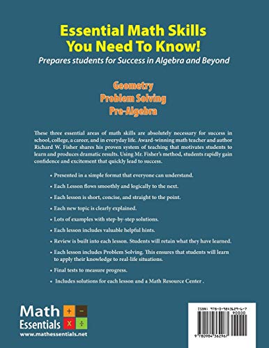 Check out our new title, Introduction to Elementary Math Grades 2 and 3 ISBN 979-8-9888207-1-0. Perfect to get students back up to speed fast. Short, easy-to-understand lessons. Video tutorials taught by the author ensure that students fully understand topics. Students will master the essential math skills that everyone needs to know! Ideal for those who fell behind during the pandemic, or for those who have struggled in the past. Get started now. ABOUT THIS BOOK: This is the ULTIMATE SURVIVAL GUIDE SUPER VOLUME. THREE SPECIFIC SKILLS BOOKS IN ONE SUPER VOLUME. Book 1: Geometry Book 2: Problem Solving Book 3: Pre-Algebra Mastery of the skills in these three books are ABSOLUTELY NECESSARY for success in elementary school, college, a career, and in everyday life. Perfect math for students who are math challenged or have struggled with math in the past. Includes access to award-winning online video tutorials. Just go to www.mathessentials.net and click on Videos button. Lessons are presented in a format that everyone can understand! Each Lesson flows smoothly and logically to the next. Each lesson is short, concise, and to the point. Lots of examples with step-by-step solutions. Each lesson includes valuable Helpful Hints. Review is built into each lesson. Students will retain what they have learned! Each lesson includes PROBLEM SOLVING. This ensures that students will learn to apply their knowledge to real-life-situations. Includes solutions for all problems. Includes a Glossary and a handy Math Resource Center. Check out our newest titles! Math Essentials Speed Wheel Drills for Addition and Multiplication. Instant recall of number facts make all math much easier. Learn them fast this summer. ISBN 978-1-7345880-7-1 and ISBN 978-1-7345880-8-8 Basic Math Skills Rescue Parts 1 and 2. Master all the skills you need to be successful in Algebra 1. Includes video tutorials. ISBN 978-0-578-81771-2 and ISBN 978-0-578-81772-9 Algebra Word Problems Made Simple. Master those dreaded algebra word problems the fast easy way. ISBN 978-0-9994433-4-7 We now have English, Spanish, and bilingual editions for many of our titles. Don’t wait! Get started now!