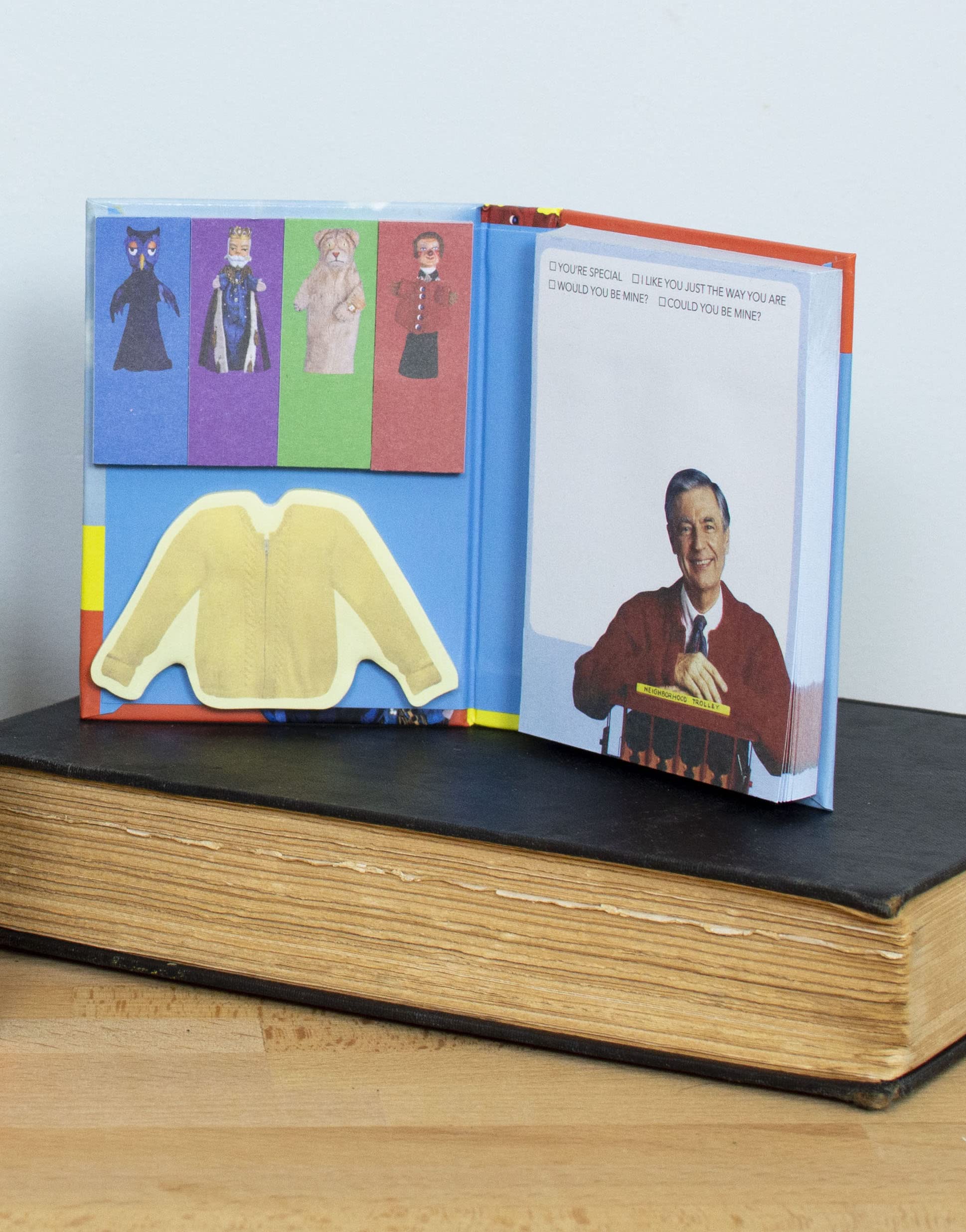 Each booklet is full of hundreds of colorful self-sticking sheets featuring 4 tab-style notes with some of the residents of the Neighborhood of Make-Believe, a small note of a Fred Rogers-style cardigan, and a large note with a picture of Mister Rogers and the famous trolley.