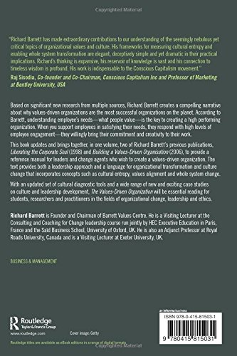 Based on significant new research from multiple sources, Richard Barrett creates a compelling narrative about why values-driven organizations are the most successful organizations on the planet. According to Barrett, understanding employee’s needs–what people value–is the key to creating a high performing organization. When you support employees in satisfying their needs, they respond with high levels of employee engagement and willingly bring their commitment and creativity to their work. This book updates and brings together in one volume, two of Richard Barrett’s previous publications, Liberating the Corporate Soul (1998) and Building a Values-Driven Organisation (2006), to provide a reference manual for leaders and change agents who wish to create a values-driven organization. The text provides both a leadership approach, and a language, for organizational transformation and culture change that incorporates concepts such as cultural entropy, values alignment and whole system change. With an updated set of cultural diagnostic tools and a wide range of new and exciting case studies on culture and leadership development, The Values-Driven Organization will be essential reading for students, researchers and practitioners in the fields of organizational change, leadership and ethics.