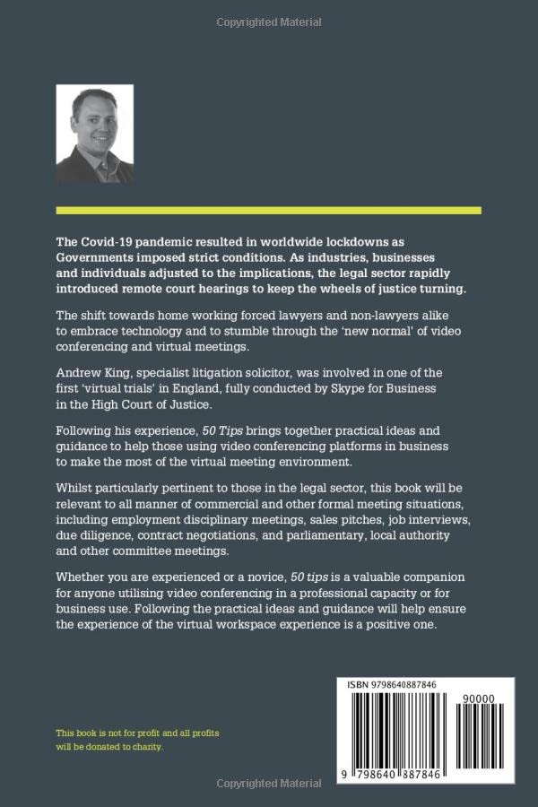The Covid-19 pandemic resulted in worldwide lockdowns as Governments imposed strict conditions. As industries, businesses and individuals adjusted to the implications, the legal sector rapidly introduced remote court hearings to keep the wheels of justice turning. The shift towards home working forced lawyers and non-lawyers alike to embrace technology and to stumble through the ‘new normal’ of video conferencing and virtual meetings. Andrew King, specialist litigation solicitor, was involved in one of the first ‘virtual trials’ in England, fully conducted by Skype for Business in the High Court of Justice. Following his experience, 50 Tips brings together practical ideas and guidance to help those using video conferencing platforms in business to make the most of the virtual meeting environment. Whilst particularly pertinent to those in the legal sector, this book will be relevant to all manner of commercial and other formal meeting situations, including employment disciplinary meetings, sales pitches, job interviews, due diligence, contract negotiations, and parliamentary, local authority and other committee meetings. Whether you are experienced or a novice, 50 tips is a valuable companion for anyone utilising video conferencing in a professional capacity or for business use. Following the practical ideas and guidance will help ensure the experience of the virtual workspace experience is a positive one. All profits from the sale of this book will be donated to NHS Charities Together (registered charity no. 1186569) in recognition of the fantastic work undertaken by the NHS staff and volunteers in caring for Covid-19 patients.