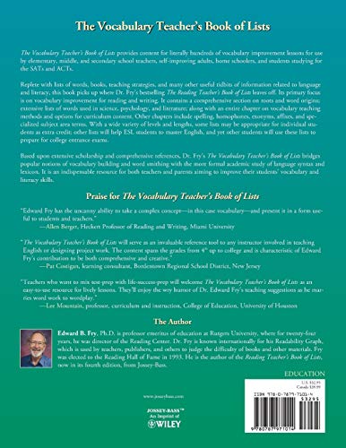 “Edward Fry has the uncanny as well as canny (choose your word) ability to take a complex concept?in this case vocabulary?and present it in a form useful to students and teachers.” Allen Berger, Heckert Professor of Reading and Writing, Miami University “The Vocabulary Teacher?s Book of Lists will serve as an invaluable reference tool to any instructor involved in teaching English or designing project work. The content spans the grades from 4th up to college and is characteristic of Edward Fry?s contribution to be both comprehensive and creative.” Pat Costigan, learning consultant, Bordentown Regional School District, New Jersey “Teachers who want to mix test-prep with life-success-prep will welcome The Vocabulary Teacher?s Book of Lists as an easy-to-use resource for lively lessons. They?ll enjoy the wry humor of Dr. Edward Fry?s teaching suggestions as he marries word work to wordplay.” Lee Mountain, professor, curriculum and instruction, College of Education, University of Houston The Vocabulary Teacher?s Book of Lists offers content for literally hundreds of vocabulary improvement lessons for elementary and secondary teachers, self-improving adults, home schoolers, and students studying for their SATs. While there are dozens of shorter high interest lists of words, the core of the book is based on Latin and Greek roots and prefixes. But the largest list is Homophones. In fact it is one of the largest lists of homophones you will ever use. This list, like many others, is appropriate for spelling lessons or writer?s reference as well as vocabulary improvement. There are two dozen teaching methods in the Methods chapter and teaching suggestions to help improve reading and writing are scattered throughout the book. The lessons can be as short as a word-a-day or as long as a school year. The range of difficulty can go from upper elementary to college freshman classes, and be as diverse as adult education to English language learners.