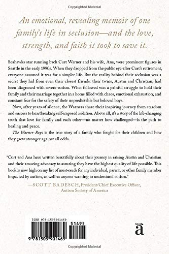An emotional, revealing memoir of one family’s life in seclusion–and the love, strength, and faith it took to save it. Seahawks star running back Curt Warner and his wife, Ana, were prominent figures in Seattle in the early 1990s. When they dropped from the public eye after Curt’s retirement, everyone assumed it was for a simpler life. But the reality behind their seclusion was a secret they hid from even their closest friends: their twins, Austin and Christian, had been diagnosed with severe autism. What followed was a painful struggle to hold their family and their marriage together in a home filled with chaos, emotional exhaustion, and constant fear for the safety of their unpredictable but beloved boys. Now, after years of silence, the Warners share their inspiring journey from stardom and success to heartbreaking self-imposed isolation. Above all, it’s a story of the life-changing truth that love for family and each other–no matter how challenged–is the path to healing and peace. The Warner Boys is the true story of a family who fought for their children and how they grew stronger against all odds.