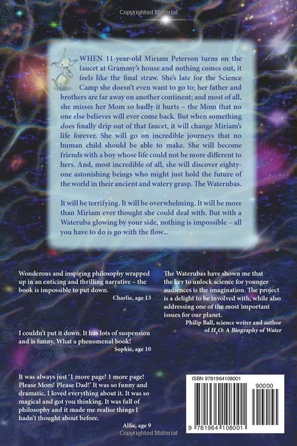 When 11 year old Miriam Peterson turns on the faucet at Grammy’s house and nothing comes out, it feels like the final straw. She’s late for the Science Camp she doesn’t even want to go to; her father and brothers are far away on another continent; and most of all, she misses her mom so badly it hurts – the mom that no one else believes will ever come back. But when something does finally drip out of that faucet, it will change Miriam’s life forever. She will go on incredible journeys that no human child should be able to make. She will become friends with a boy whose life could not be more different to hers. And, most incredible of all, she will discover eighty-one astonishing beings who might just hold the future of the world in their ancient and watery grasp. The Waterubas.