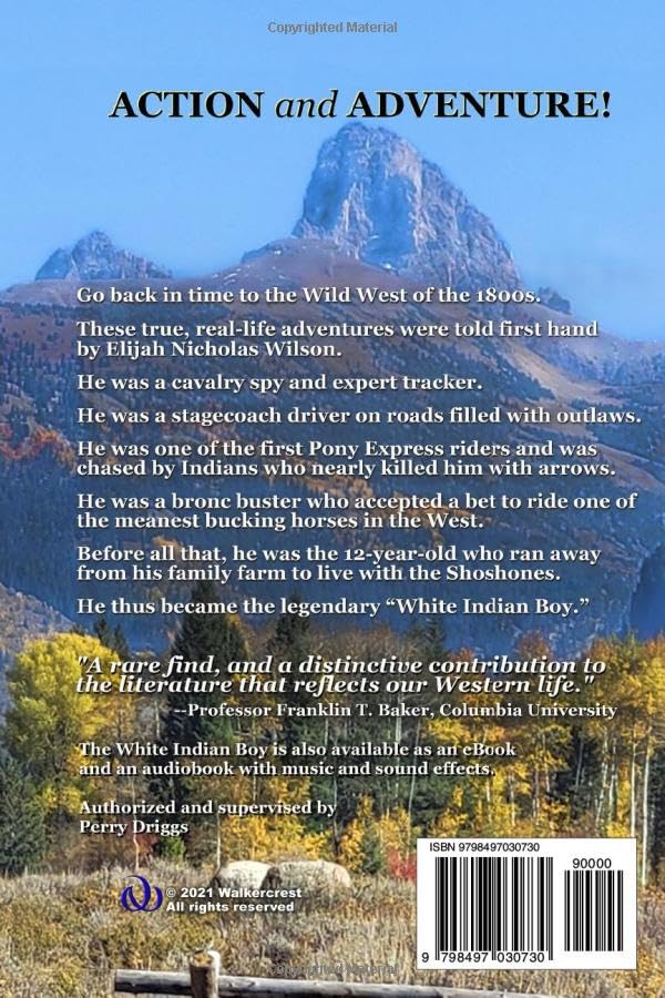 A TRUE STORY that takes you back in time to the WILD WEST of the 1800s! These real-life adventures were told first-hand by Elijah Nicholas Wilson. He was the twelve-year-old who RAN AWAY from his family farm TO LIVE WITH A TRIBE OF SHOSHONES. He thus became the legendary “WHITE INDIAN BOY” He was a CALVARY SPY and EXPERT TRACKER, a STAGECOACH DRIVER on roads filled with OUTLAWS. He was one of the FIRST PONY EXPRESS RIDERS and was chased by Indians who nearly killed him with arrows. He was a bronc buster who accepted a bet to ride one of the meanest bucking horses in the west. This is the AUTHORIZED EDITION as supervised by Perry Driggs, the son of Howard R. Driggs and contains 74 HISTORICAL PHOTOS and DRAWINGS from that time period. WINNER of the 2024 GOLD AWARD for children’s historic non-fiction from the Global Awards.