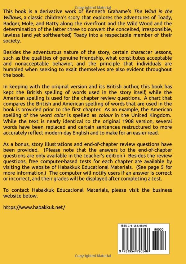 This book is a derivative work of Kenneth Grahame’s The Wind in the Willows, a classic children’s story that explores the adventures of Toady, Badger, Mole, and Ratty along the riverfront and the Wild Wood and the determination of the latter three to convert the conceited, irresponsible, lawless (and yet softhearted) Toady into a respectable member of their society. Besides the adventurous nature of the story, character lessons, such as the qualities of genuine friendship, what constitutes acceptable and nonacceptable behavior, and the principle that individuals are humbled when seeking to exalt themselves are also evident throughout the book. In keeping with the original version and its British author, this book has kept the British spelling of words used in the story itself, while the American spelling is used for the chapter review questions. A chart that compares the British and American spelling of words that are used in the book is provided prior to the first chapter. As an example, the American spelling of the word color is spelled as colour in the United Kingdom. While the text is nearly identical to the original 1908 version, several words have been replaced and certain sentences restructured to more accurately reflect modern-day English and to make for an easier read. As a bonus, story illustrations and end-of-chapter review questions have been provided. (Please note that the answers to the end-of-chapter questions are only available in the teacher’s edition.) Besides the review questions, free computer-based tests for each chapter are available by visiting the website of Habakkuk Educational Materials. (See page 5 for more information.) The computer will notify users if an answer is correct or incorrect, and their grades will be displayed after completing a test. To contact Habakkuk Educational Materials, please visit the business website.