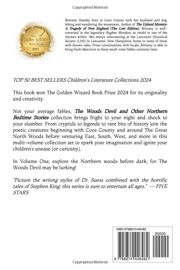 TOP 50 BEST SELLERS Children’s Literature Collections 2024 This book won The Golden Wizard Book Prize 2024 for its originality and creativity. Not your average fables, The Woods Devil and Other Northern Bedtime Stories brings fright to your night and shock to your slumber. From cryptids to legends to rare bits of history join the poetic creatures beginning with Coos County and around The Great North Woods before venturing East, South, West and more in this multi-volume collection set to spark your imagination and ignite your children’s unease (or curiosity). In Volume One, explore the northern woods before dark, for the Woods Devil may be lurking! “Picture the writing styles of Dr. Suess combined with the horrific tales of Stephen King; this series is sure to entertain all ages.” – FIVE STARS
