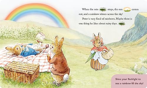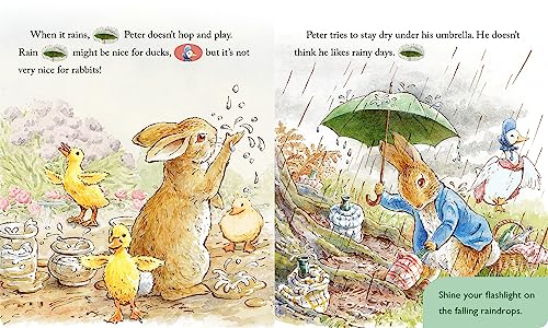 Peter Rabbit has fun whatever the weather! Grab your flashlight to explore with Peter and see what he loves about sunny, rainy, and snowy days. The foiled pages sparkle and shine in your flashlight’s glow, and 5 buttons on the flashlight play sounds to enhance the story! This sound storybook set encourages imagination, exploration, and learning through play. Includes a real working flashlight.