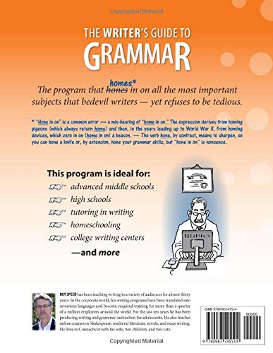 This program serves either as a self-paced home-study course or for classroom coursework. It puts in place skills and knowledge essential to clear writing. To produce clear writing, you must feel at home with English sentence structure and punctuation. You must also have at your fingertips the vocabulary you need to express nuanced thoughts. So this program is designed to enable you to: –master the most important points of English grammar and usage;–perceive with little effort both the structure of a sentence and how proper punctuation can enhance that structure;–employ with dictionary-precision a rich arsenal of English words.Roy Speed’s “Writer’s Guide to Grammar” provides complete training in English grammar, usage, and punctuation — but with a twist: it emphasizes the topics that people who write actually need to know. Also, it corrects the most common misconceptions, the things people think they know but actually know wrong.Most important, the program places the greatest emphasis where it belongs — on the concepts most critical to effective writing. Those concepts are presented in an easy-to-understand manner and are clearly illustrated with simple examples. The entire program is laid out to maximize efficient learning. “The Writer’s Guide to Grammar” helps with all of the following challenges: –Moving knowledge into long-term memory. To drive home the critical concepts, the program is stealthy: it may not feel like it, but it incorporates drill, repetition, and review sufficient to master the critical guidelines for usage and punctuation.–Keeping the learner engaged. Among the standout features of the program are its attractive appearance, variety, and humor — all of which can be critical aids to learning. Put another way: In this program, drill and repetition never feel like drill and repetition.–Applying the knowledge to real-world situations. The program is filled with activities that look not like grammar exercises, but real-life writing challenges — memos, letters, articles, and essays.This program has been used successfully by high school and college students but is perfectly suitable for anyone who wants to improve his or her writing.