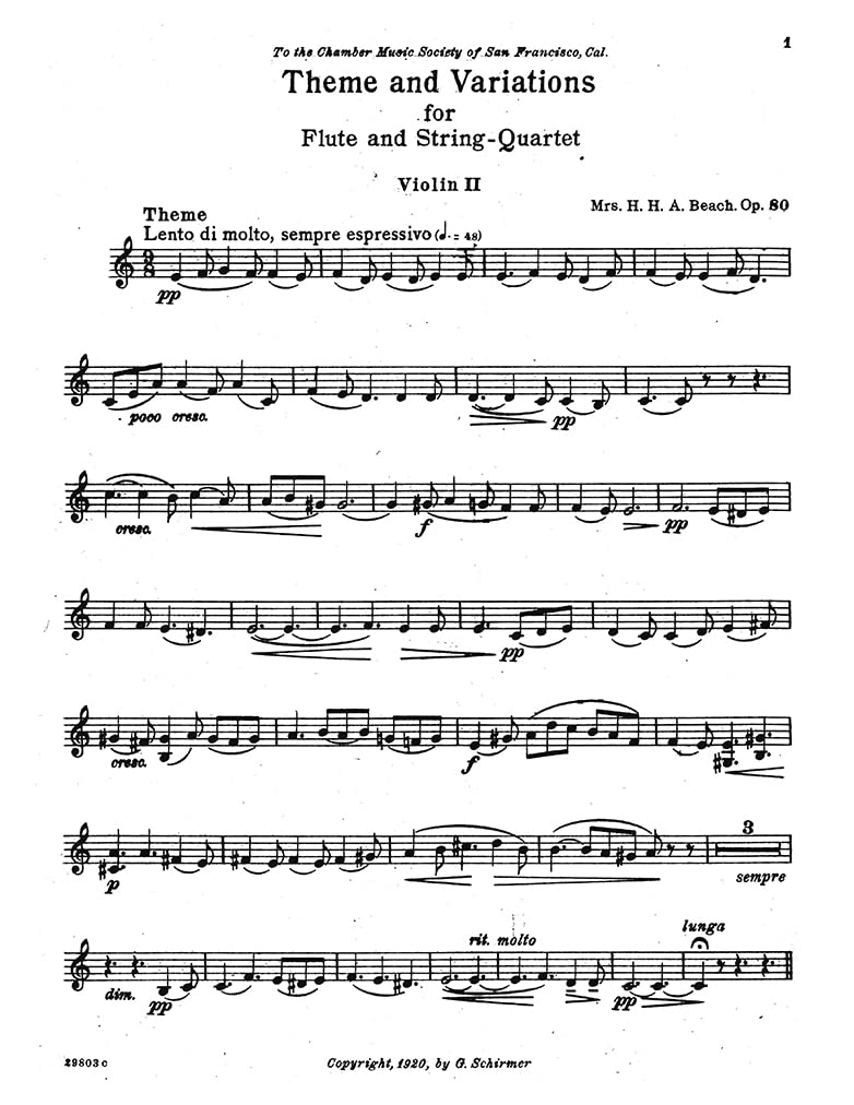 Printed sheet music to the work Theme and variations for flute and string quartet by Amy Marcy Beach. This work is cataloged as Op. 80. This is a set of all parts to the work.. This work is scored for Flute & String Quartet. This is a Performer’s Reprint, which is a digital reprint of historical editions. Documents are cleaned, cropped, and straightened before printing on modern, acid-free paper. A portion of each sale supports both the International Music Score Library Project and small performing arts organizations to provide performance opportunities for both professional and amateur musicians.