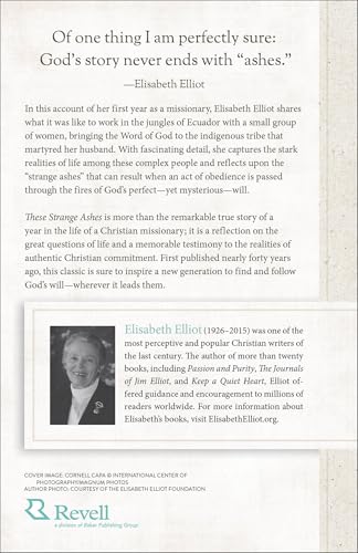 In this deeply personal account of her first year as a missionary, Elisabeth Elliot shares what it was like to work in the jungles of Ecuador with a small group of women, bringing the Word of God to the indigenous tribe that martyred her husband. With fascinating detail, she captures the stark realities of life among these complex people and reflects upon the “strange ashes” that can result when an act of obedience is passed through the fires of God’s perfect–yet mysterious–will. These Strange Ashes is more than a remarkable sharing of a year in the life of a Christian missionary; it is a reflection on the great questions of life and a memorable testimony to the realities of authentic Christian commitment. First published nearly 40 years ago, this classic is sure to inspire a new generation to find and follow God’s will–wherever it leads them.