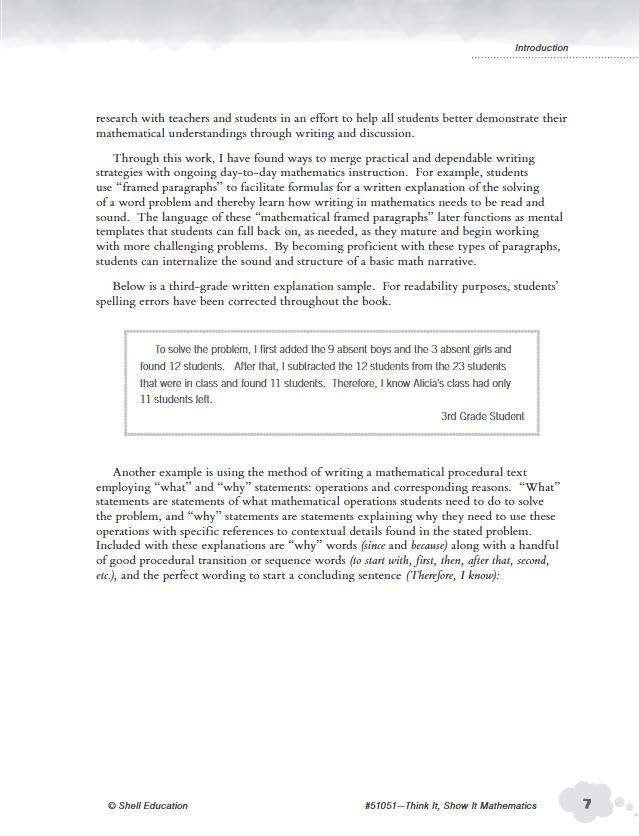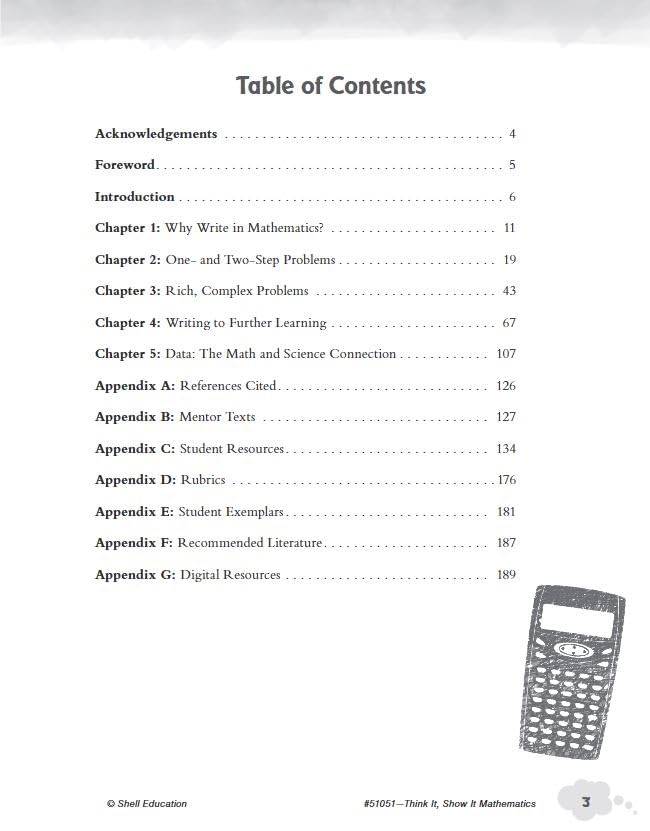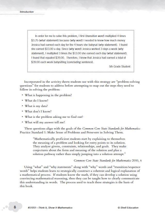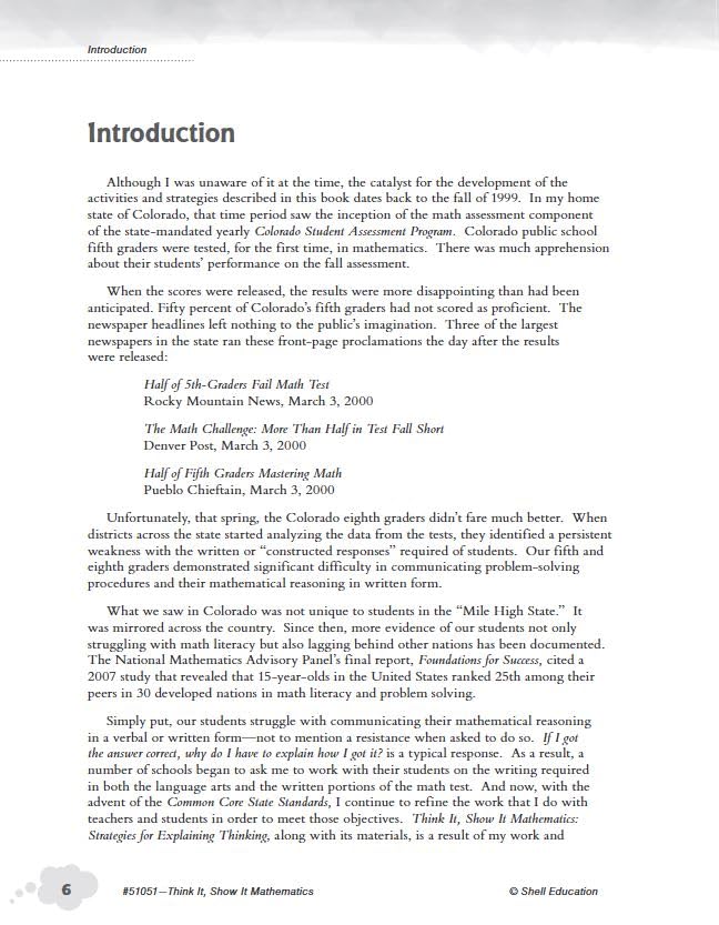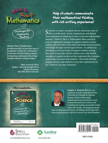 Help students put their thinking onto paper with step-by-step strategies that develop concise writing and discussion skills. With Think It, Show It: Mathematics, students in grades 3-8 will learn through guided instruction how to express themselves mathematically, think conceptually, and gain essential critical-thinking skills. Strategy instruction is supported by the included student activities, sentence frames, rubrics, exemplar writing samples, and graphic organizers. About Shell Education Rachelle Cracchiolo started the company with a friend and fellow teacher. Both were eager to share their ideas and passion for education with other classroom leaders. What began as a hobby, selling lesson plans to local stores, became a part-time job after a full day of teaching, and eventually blossomed into Teacher Created Materials. The story continued in 2004 with the launch of Shell Education and the introduction of professional resources and classroom application books designed to support Teacher Created Materials curriculum resources. Today, Teacher Created Materials and Shell Education are two of the most recognized names in educational publishing around the world.
