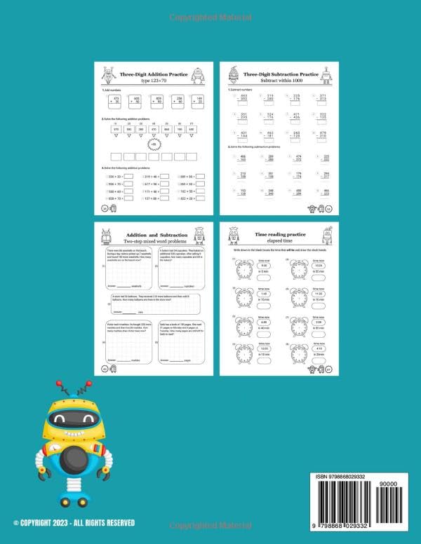 Elevate Third-Grade Math Skills with Exciting Addition and Subtraction Adventures! Ever feel like your child is lost in a sea of three-digit numbers? This math workbook transforms confusion into confidence. Breaking free from the idea that math success is confined to the classroom! Our workbook brings the classroom to your home, making three-digit math, word problems, and clock challenges accessible and conquerable wherever you are. Forget the myth that only geniuses excel in math! Our workbook unlocks the potential in every child, making three-digit mastery accessible to all aspiring mathematicians. Inside, you will discover: * 1120 problems * Exercises to understand the 3-digit concept * Focus on 3-digit addition and subtraction * A considerable amount of 2-step word problems, money word problems, clock practice * Answer key * Different difficulty levels * Cute robots to keep your kid entertained * Large print 8.5X11 in If your child finds math challenging, and you are worried that a workbook on 3-digit addition and subtraction might be too difficult for them at this stage, this workbook is designed with a progressive approach. It starts with simpler problems and gradually increases in complexity. If your kid’s schedule is already packed with school and extracurricular activities, so they don’t have enough time for additional work from a workbook, this one can be integrated into existing routines. Even short, focused sessions a few times a week can be beneficial. It’s about quality over quantity. Boost your child’s math proficiency and confidence with engaging 3-digit addition and subtraction exercises. Scroll up and click the “Add to Cart” button now!