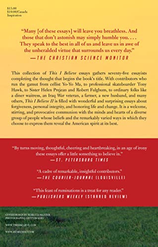 The new paperback in the bestselling series of inspiring personal philosophies This collection of This I Believe essays gathers seventy-five essayists–ranging from famous to previously unknown–completing the thought that begins the book’s title. With contributors who run the gamut from cellist Yo-Yo Ma, to professional skateboarder Tony Hawk, to ordinary folks like a diner waitress, an Iraq War veteran, a farmer, a new husband, and many others, This I Believe II, like the first New York Times bestselling collection, showcases moving and irresistible essays. Included are Sister Helen Prejean writing about learning what she truly believes through watching her own actions, singer Jimmie Dale Gilmore writing about a hard-won wisdom based on being generous to others, and Robert Fulghum writing about dancing all the dances for as long as he can. Readers will also find wonderful and surprising essays about forgiveness, personal integrity, and honoring life and change. Here is a welcome, stirring, and provocative communion with the minds and hearts of a diverse, new group of people–whose beliefs and the remarkably varied ways in which they choose to express them reveal the American spirit at its best.