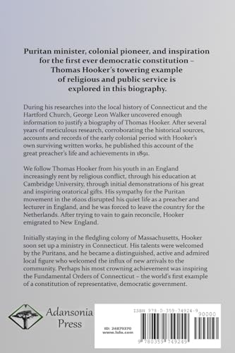 Puritan minister, colonial pioneer, and inspiration for the first ever democratic constitution – Thomas Hooker’s fine example of religious and public service is explored in this biography. During his researches into the local history of Connecticut and the Hartford Church, George Leon Walker uncovered enough information to justify a biography of Thomas Hooker. After several years of meticulous research, corroborating historical sources, accounts and records of the early colonial period with Hooker’s own surviving written works, he published this account of the great preacher’s life and achievements in 1891. We follow Thomas Hooker from his youth in an England rent by religious conflict, through his education at Cambridge University, through initial demonstrations of his great and inspiring oratorical gifts. His sympathy for Puritanism in the 1620s disrupted his quiet life as a preacher and lecturer in England, and he was forced to leave the country for the Netherlands, and then onward to New England.