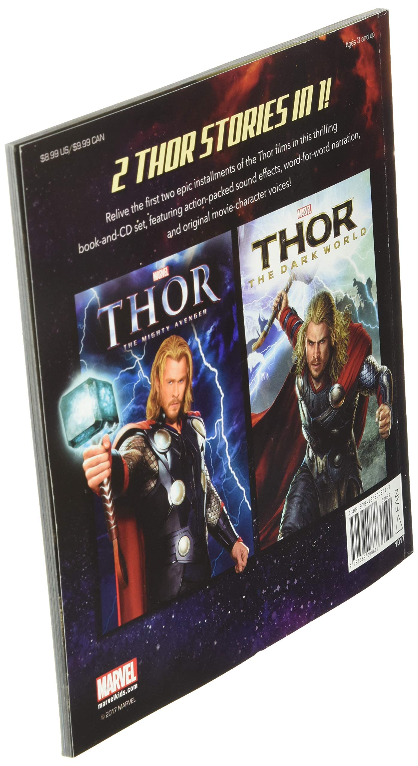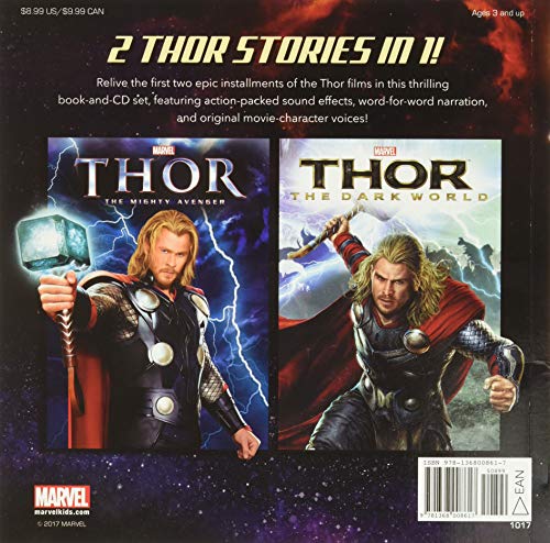 In our first story, Thor will soon inherit the throne of Asgard from his aging father. However, on the day that he is to be crowned, Thor reacts with brutality when the gods’ enemies, the Frost Giants, enter the palace in violation of their treaty. As punishment, Odin banishes Thor to Earth. While Loki, Thor’s brother, plots mischief in Asgard,Thor, now stripped of his powers, faces his greatest threat. Then just flip the book over and dive into the ancient world where the gods of Asgard fought and won a war against an evil race known as the Dark Elves. Hundreds of years later, Jane Foster finds the Aether and becomes its host, forcing Thor to bring her to Asgard before Dark Elf Malekith captures her and uses the weapon to destroy the Nine Realms — including Earth! This double feature storybook includes 64-pages of action-packed sound effects, word-for-word narration, and original movie voices!