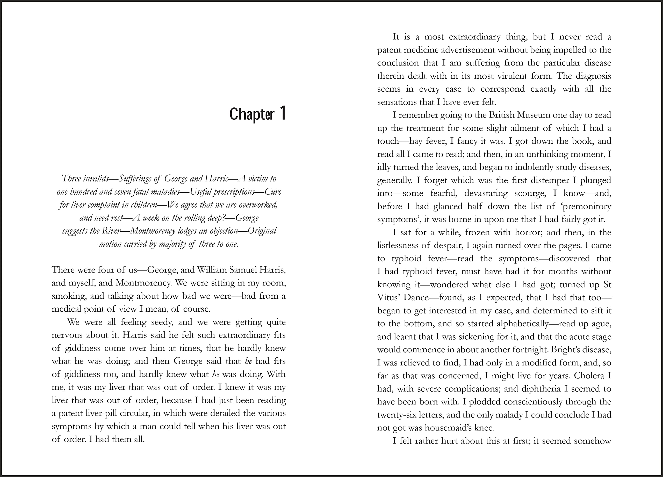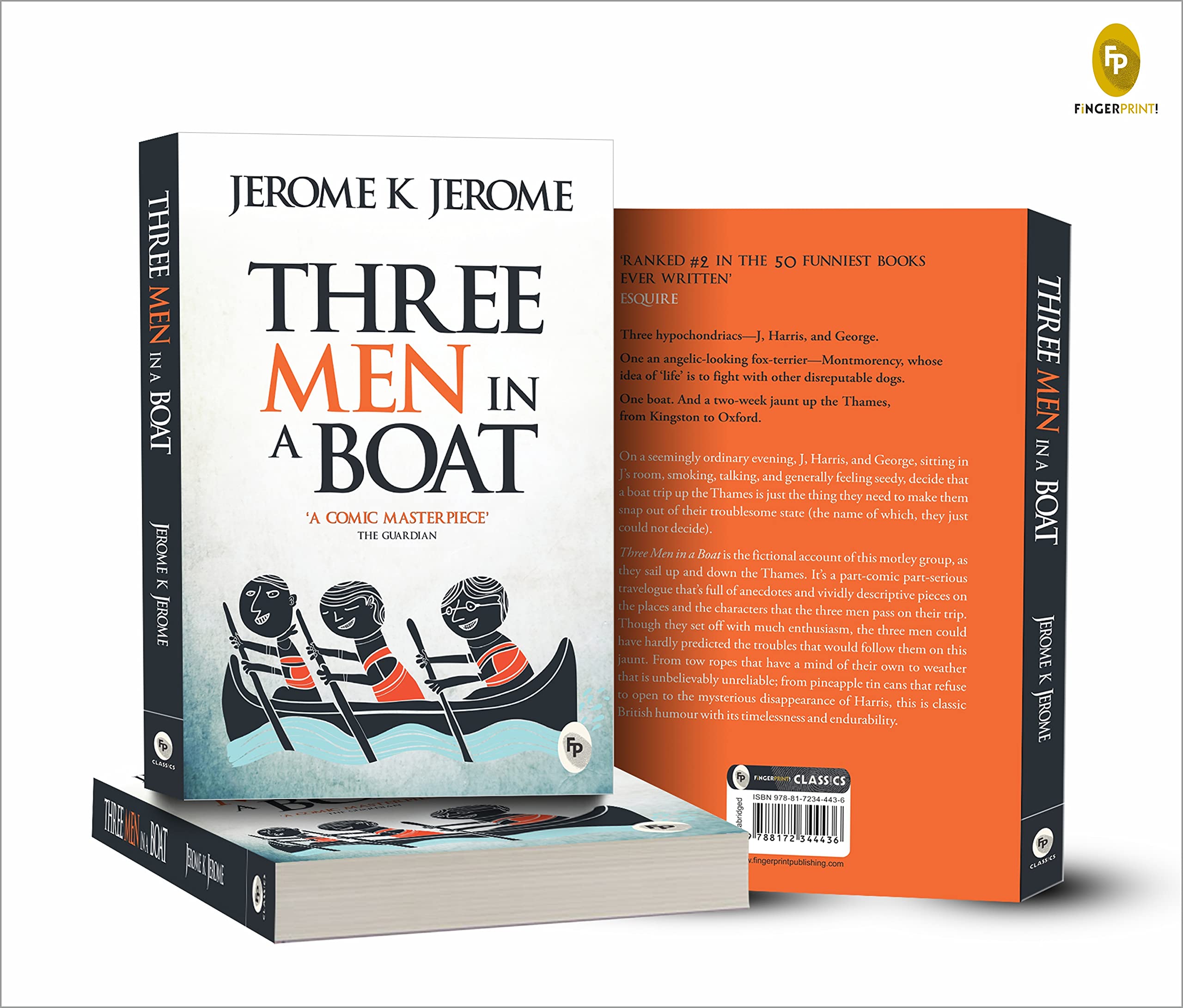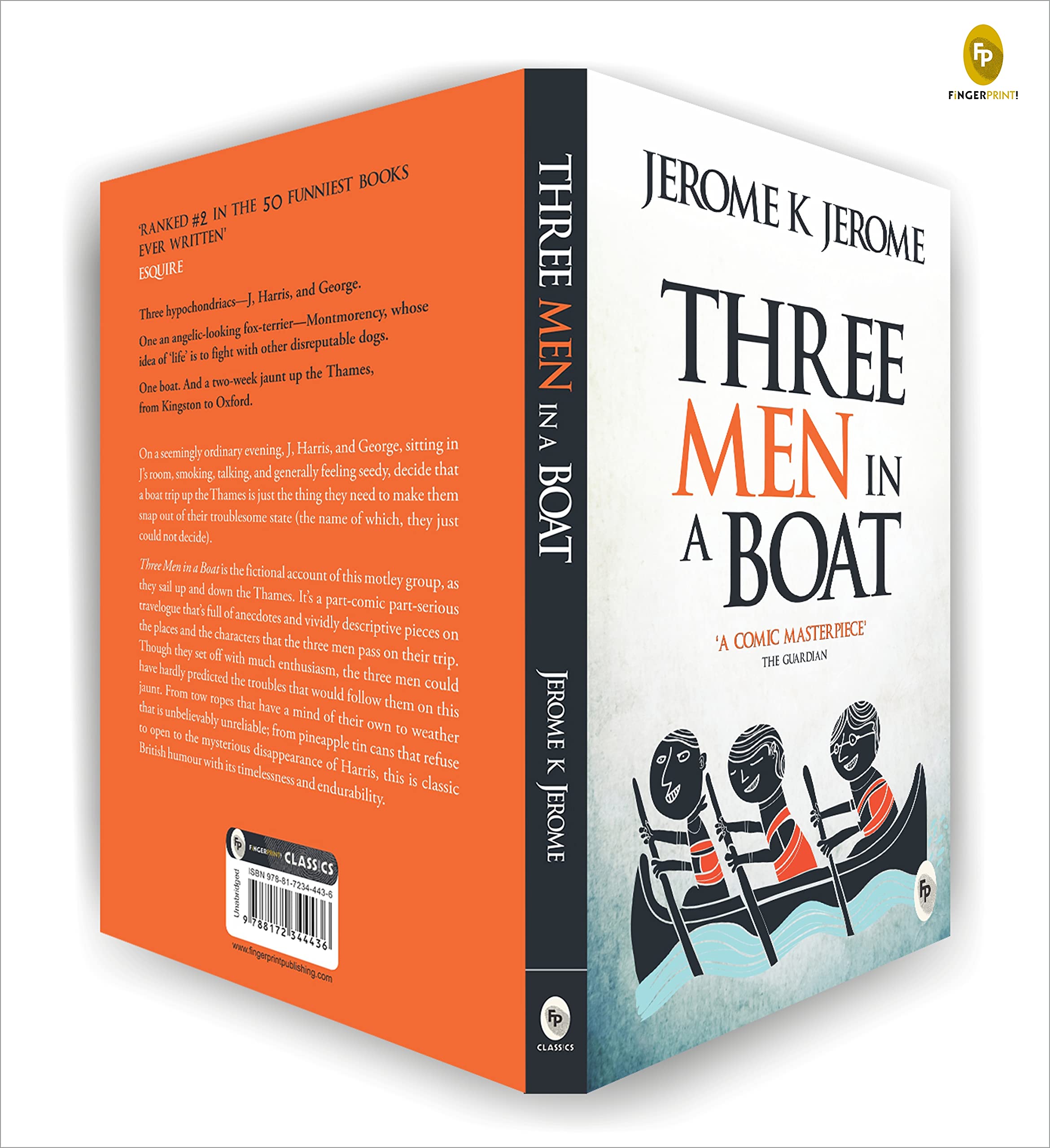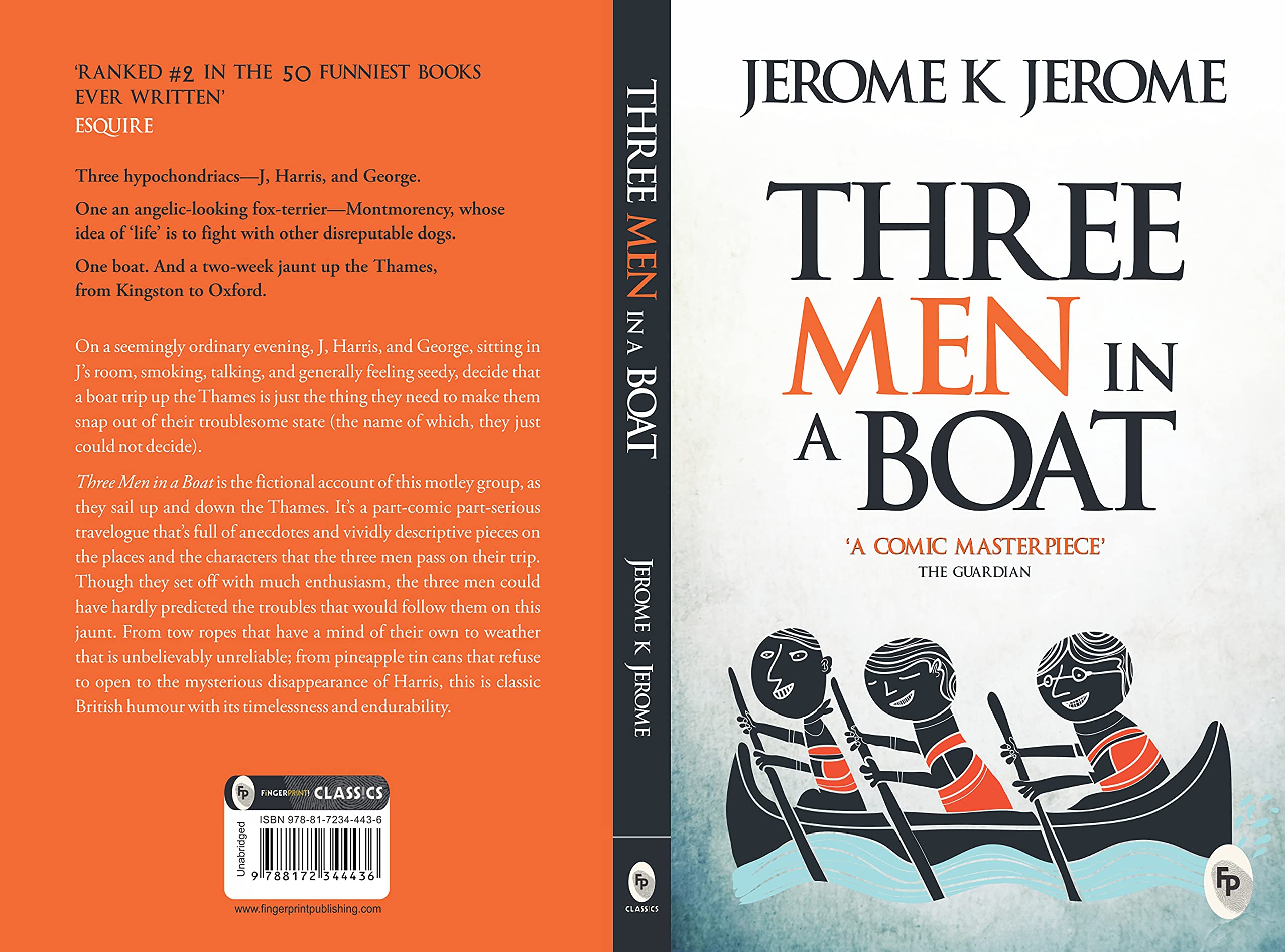 Three Men in a Boat (To Say Nothing of the Dog), published in 1889, is a humorous account by English writer Jerome K. Jerome of a boating holiday on the Thames between Kingston and Oxford. The book was initially intended to be a serious travel guide, with accounts of local history along the route, but the humorous elements took over to the point where the serious and somewhat sentimental passages seem a distraction to the comic novel. One of the most praised things about Three Men in a Boat is how undated it appears to modern readers – the jokes seem fresh and witty even today. The three men are based on Jerome himself and two real-life friends, George Wingrave (who would become a senior manager at Barclays Bank) and Carl Hentschel (the founder of a London printing business, called Harris in the book), with whom J. often took boating trips. The dog, Montmorency, is entirely fictional but, “as Jerome admits, developed out of that area of inner consciousness which, in all Englishmen, contains an element of the dog.” The trip is a typical boating holiday of the time in a Thames camping skiff. This was just after commercial boat traffic on the Upper Thames had died out, replaced by the 1880s craze for boating as a leisure activity.