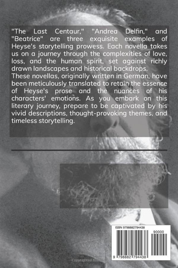 “The Last Centaur,” “Andrea Delfin,” and “Beatrice” are three exquisite examples of Heyse’s storytelling prowess. Each novella takes us on a journey through the complexities of love, loss, and the human spirit, set against richly drawn landscapes and historical backdrops. These novellas, originally written in German, have been meticulously translated to retain the essence of Heyse’s prose and the nuances of his characters’ emotions. As you embark on this literary journey, prepare to be captivated by his vivid descriptions, thought-provoking themes, and timeless storytelling. Whether you are a seasoned reader of Heyse’s works or encountering his writing for the first time, this collection offers a captivating exploration of his diverse literary talents. Each novella promises a unique and enriching experience, inviting you to delve into worlds of myth, passion, and the complexities of human relationships