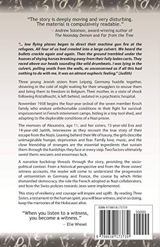 “Low flying planes began to direct their machine gun fire at the refugees. All four of us had crawled into a large culvert. We heard the bullets crackle again and again. Then the ground trembled under the hooves of shying horses breaking away from their fully laden carts. They raced above our heads sounding like wild drum beats. I was lying in the culvert, pulling snails from the walls, as unconcerned as if all this had nothing to do with me. It was an almost euphoric feeling.” Three young Jewish sisters from Leipzig, Germany huddle together in the cold darkness of night waiting for their smugglers to rescue them and bring them to freedom in Belgium. Their mother, in a state of shock following Kristallnacht, is left behind, sedated in a psychiatric hospital. November 1938 begins the four-year ordeal of the seven member Kroch family who endure unfathomable conditions in their fight for survival: imprisonment in French internment camps, hiding in a tiny tool shed, and adapting to the deplorable conditions of a Nazi prison. The memoirs of Alexandra, age 11, and her sisters, 15-year-old Eva and 14-year-old Judith, interweave as they recount the true story of their escape from the Nazis. “Leaving behind their life of luxury, the girls describe unimaginable hunger, deprivation and fear. Family love, music, and the close friendship of strangers are the essential ingredients that sustain them through the hardships they face at every step. Two factors ultimately saved them: rescuers and enormous luck. A narrative backdrop threads through the story, providing the socio-political context. From a historical perspective and from the three sisters’ witness accounts, the reader will come to understand the progression of antisemitism in Germany and France, the course by which Hitler dismantled democracy, the role France adopted as Nazi collaborators, and how the Swiss policies towards Jews were executed. “This story of resiliency and courage will inspire and uplift. By reading Three Sisters, a testament to the human spirit, you will bear witness, and in so doing, keep the memories of the Holocaust alive. “When you listen to a witness, you become a witness.” — Elie Wiesel “The story is deeply moving and very disturbing. The material is compelling and reads beautifully.” — Andrew Solomon, award-winning author of “The Noonday Demon” and “Far from the Tree”