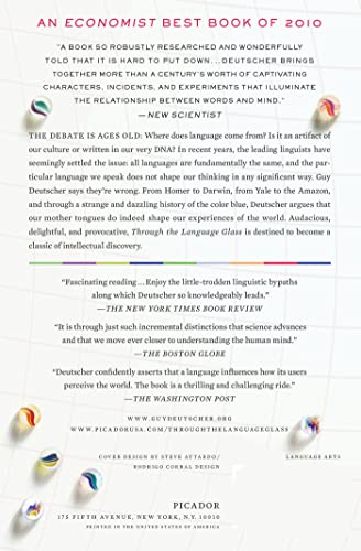 A New York Times Editor’s Choice An Economist Best Book of 2010 A Financial Times Best Book of 2010 A Library Journal Best Book of 2010 The debate is ages old: Where does language come from? Is it an artifact of our culture or written in our very DNA? In recent years, the leading linguists have seemingly settled the issue: all languages are fundamentally the same and the particular language we speak does not shape our thinking in any significant way. Guy Deutscher says they’re wrong. From Homer to Darwin, from Yale to the Amazon, and through a strange and dazzling history of the color blue, Deutscher argues that our mother tongues do indeed shape our experiences of the world. Audacious, delightful, and provocative, Through the Language Glass is destined to become a classic of intellectual discovery.