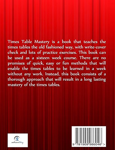 Times Table Mastery is a book that teaches the times tables the old fashioned way, with write-cover-check and lots of practice exercises. This book can be used as a sixteen week course. There are no promises of quick, easy or fun methods that will enable the times tables to be learned in a week without any work. Instead, this book consists of a thorough approach that will result in a long lasting mastery of the times tables. This book is most suited to the child in grade 4 or above. This may not be the best book for the younger or weaker student.