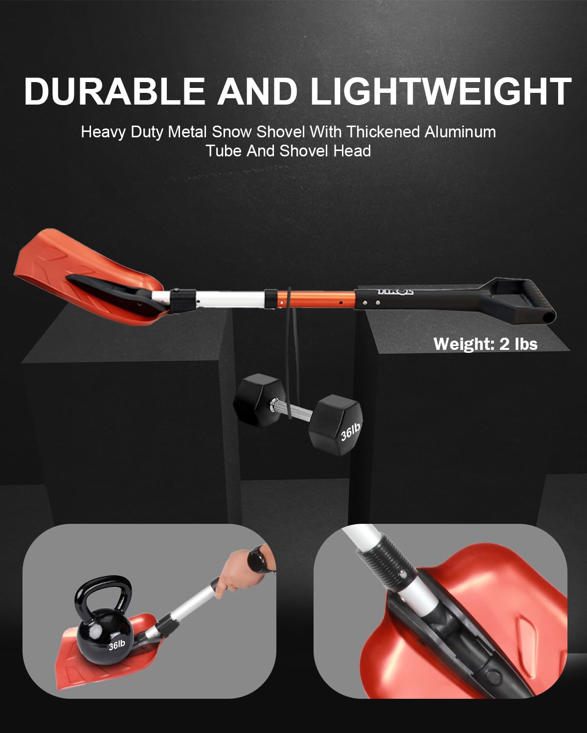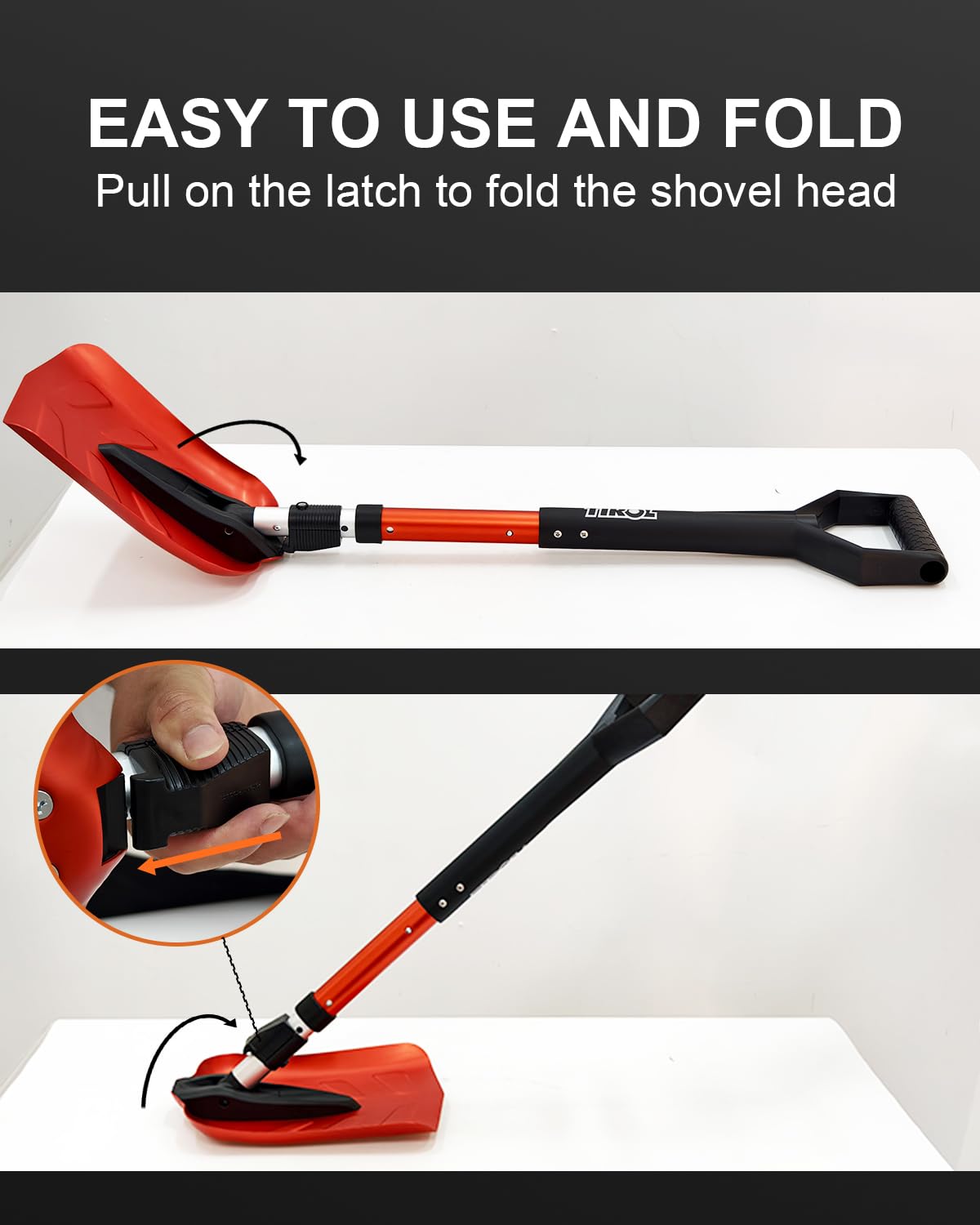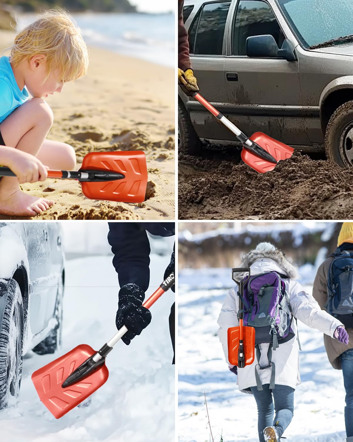 - SPACE-SAVING FOLDING DESIGN – Folding shovel, Featuring an ultra-compact collapsible design, this portable shovel can be conveniently stored anywhere, be it in your backpack or under your car seat. Thus, you can be well-prepared for any situation during your adventures.