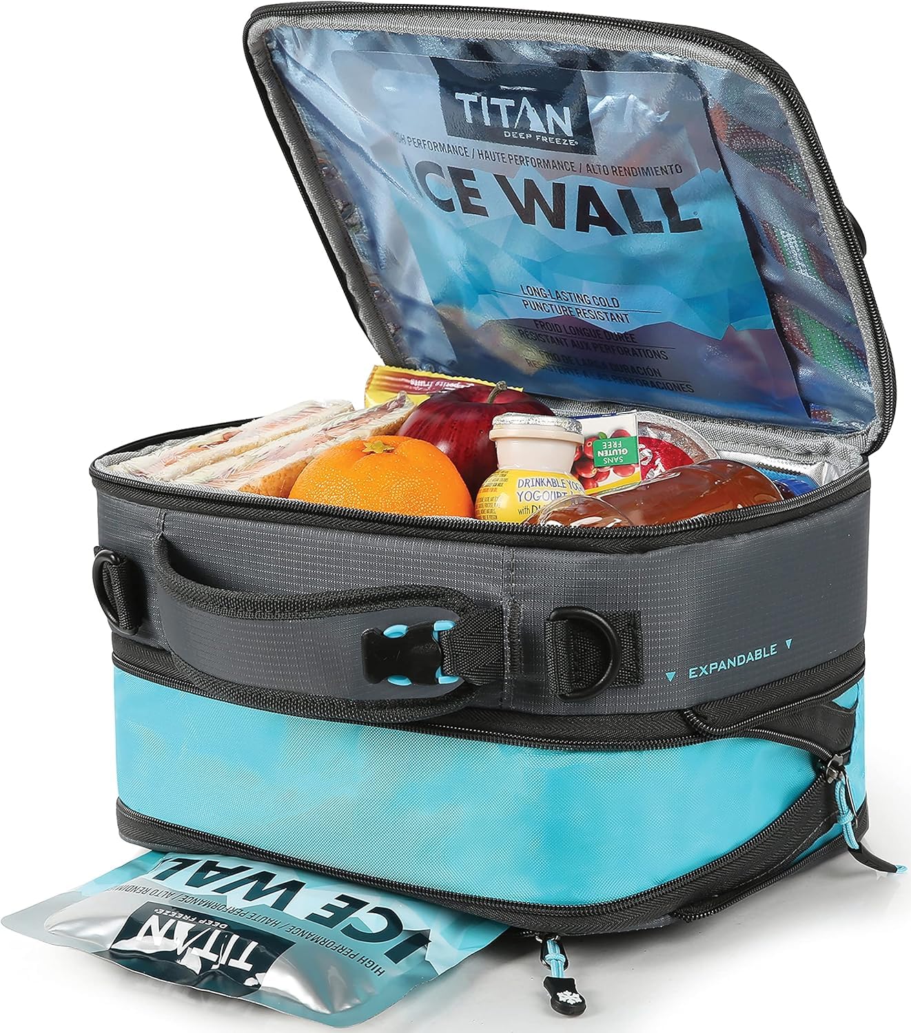 Expandable provides double capacity when expanded and includes a leak proof food container set. The lunch box features two high performance Ice Walls, which in combination with SuperFoam insulation and Therma-Flect radiant barrier, provide superior cooling to keep food fridge cold. The Ice Walls fit inside two exterior pockets allowing you to pack lunch the night before, refrigerate it and insert the frozen Ice Walls in the morning without losing any of the cold by opening the lunch box. It has a water repellent exterior and can be carried horizontally or vertically by its handles or by the removable, adjustable shoulder strap. The handle also includes a Swing Clip that attaches to backpacks for hands free carrying.