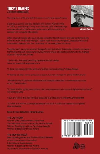 Running from a life she didn’t choose, in a city she doesn’t know Sukanya, a young Thai girl, escapes into Tokyo. With her Bangkok street smarts, she stays ahead of traffickers willing to do anything to recover the computer she took when she fled a murder scene. After befriending Chiho, a Japanese girl living in an internet cafe, Sukanya tries to rid herself of her pursuers, and her past, forever. In Tokyo, street smarts aren’t always enough Detective Hiroshi Shimizu leaves the safe confines of his office to investigate a triple murder at a porn studio. The studio’s accounts point him in multiple directions at once. Together with ex-sumo wrestler Sakaguchi and old-school Takamatsu, Hiroshi tracks the killers through Tokyo’s teen hangouts, bayside docks, and crowded squares, straight into the underbelly of the global economy. As bodies wash up from Tokyo Bay, Hiroshi tries to find the Thai girl whose name he doesn’t even know. He uncovers trafficking rings and cryptocurrency scammers whose connections extend to the highest levels of Tokyo’s power elite. TOKYO TRAFFIC is the third in the Tokyo-based Detective Hiroshi series by award-winning author Michael Pronko. Gold Award Literary Titan (2020) Gold Medallion Book Readers Appreciation Group (B.R.A.G.) (2020) Long-listed Shelf Unbound Best Indie Book (2020) Reviewer’s Choice Feathered Quill Book Awards (2020) Winner Thriller Independent Press Award (2021) Winner Thriller National Indie Excellence Awards (2021) First Runner-Up Eric Hoffer Award 2021 Shortlist Rubery Book Awards for fiction 2021