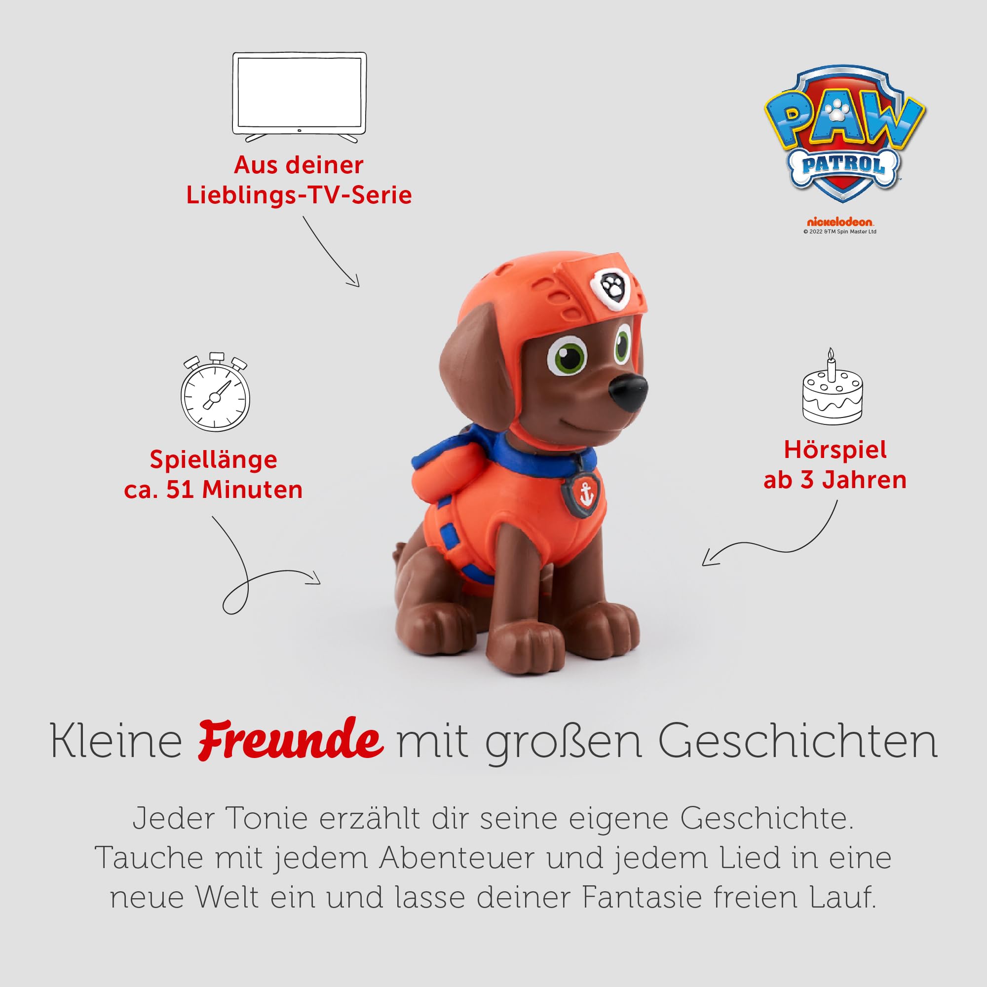 • Box contents and details – Paw Patrol Tonie Zuma figure, with Paw Patrol audio game: Zuma, 4 exciting stories for kids aged 3 and up, playing time: approx. 51 minutes