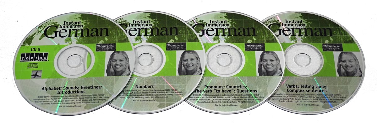 Instant Immersion German Language 4 Audio CD Set with Phrasebook Yes, you can listen in your car!! Your Passport to Language Fluency From the worldwide leader in language learning, Instant Immersion German Deluxe is the preferred method to learn your new language. Your passport to language proficiency has been issued! Take your learning with you! The comprehensive Instant Immersion German Audio curriculum, developed by university instructors, keeps you learning on the move. 4 Audio CDs: Alphabet – Sounds – Greetings – Introductions Numbers Pronouns – Countries – The verb “to have” – Questions Verbs – Telling Time – Complex Sentences