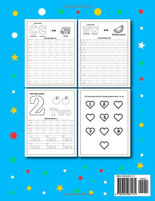 This workbook helps young children develop fine motor skills and foundational literacy and numeracy by tracing letters and numbers.