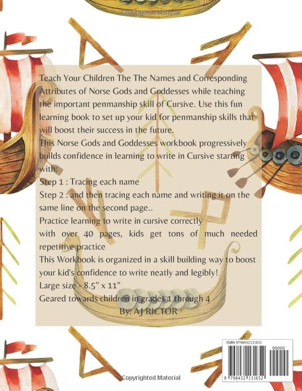 Teach Your Children The The Names and Corresponding Attributes of Norse Gods and Goddesses while teaching the important penmanship skill of Cursive. Use this fun learning book to set up your kid for penmanship skills that will boost their success in the future. This Norse Gods and Goddesses workbook progressively builds confidence in learning to write in Cursive starting with: Step 1 : Tracing each name . Step 2 : then tracing each name and writing it on the same line on the second page.. Practice learning to write in cursive correctly with over 40 pages, kids get tons of much needed repetitive practice This Workbook is organized in a skill building way to boost your kid’s confidence to write neatly and legibly! Large size – 8.5″ x 11″ Geared towards children in grades 1 through 4