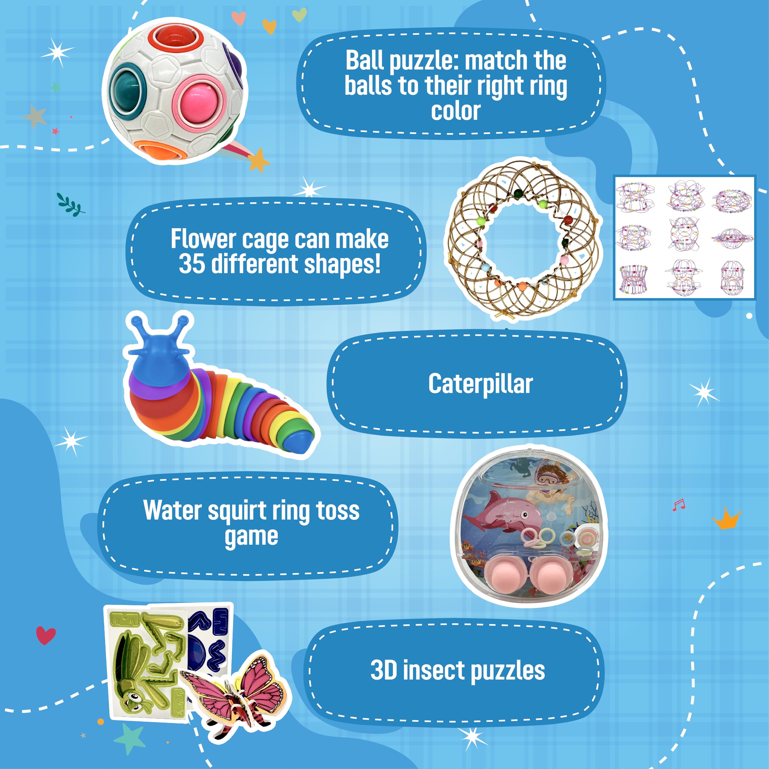 - Includes: Slug, Ball Puzzle, Silicone Suction Men, Sensory Noodles, Paper 3d Insect, Water Squirt Ring Toss, Butter Slime, Flower Cage Puzzle, 7 Ft Sticky Coloring Roll With Crayons, Pop Fidget Spinner And Watercolor Paint Booklet With Built In Paint.