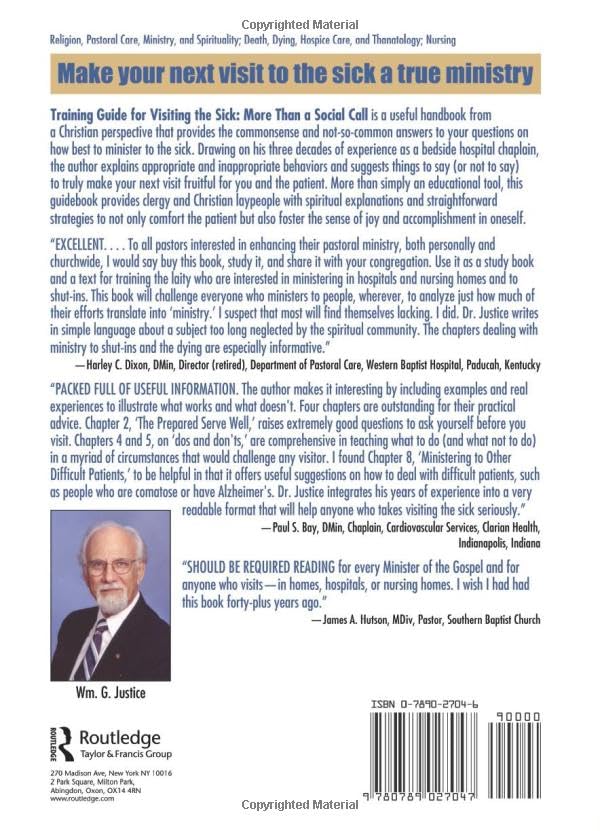 Understand the basic practical aspects of pastoral careand make your visit to the sick meaningful for both of you! Training Guide for Visiting the Sick: More Than a Social Call is a useful handbook from a Christian perspective that provides the common sense and not-so-common answers to your questions on how best to minister to the sick. Drawing on his three decades of experience as a bedside hospital chaplain, the author explains appropriate and inappropriate behaviors and suggests things to say (or not to say) to truly make your next visit fruitful for you and the patient. More than simply an educational tool, this guidebook provides clergy and Christian laypeople with spiritual explanations and straightforward strategies to not only comfort the patient but also foster the sense of joy and accomplishment in oneself. Training Guide for Visiting the Sick: More Than a Social Call teaches you to glean a positive experience from a difficult task, the visit to the sick. The author shares his insights learned in his lengthy and distinguished career in this instructional guidebook. Honest and compassionate in its portrayal of the sick and dying, the book prepares the reader spiritually, emotionally, and even physically for the challenge of the visit while focusing on the distress and the needs of the patient. At times stating practical common sense, other times shining an insightful light on the less physical aspects of the visit, this educational handbook is invaluable for all who minister, or wish to minister, to the sick. Training Guide for Visiting the Sick: More Than a Social Call discusses: Jesus’ Eleventh CommandmentTo Love One Another how to prepare yourself spiritually and emotionally for the visit the hospital patient’s world explanations of patients’ possible emotional, financial, family, and spiritual distress do’s and don’ts to note before and during a visit to the patient’s room the special needs of shut-ins ministering to the dying ministering to difficult patients ministering to Alzheimer’s or comatose patients Training Guide for Visiting the Sick: More Than a Social Call is a practical educational guide for pastors, supervisors in clinical pastoral education programs, CPE students, college and seminary students in courses in ministry to the sick, police and fire department chaplains, and family and friends of hospitalized, nursing home, and assisted living patients/residents.