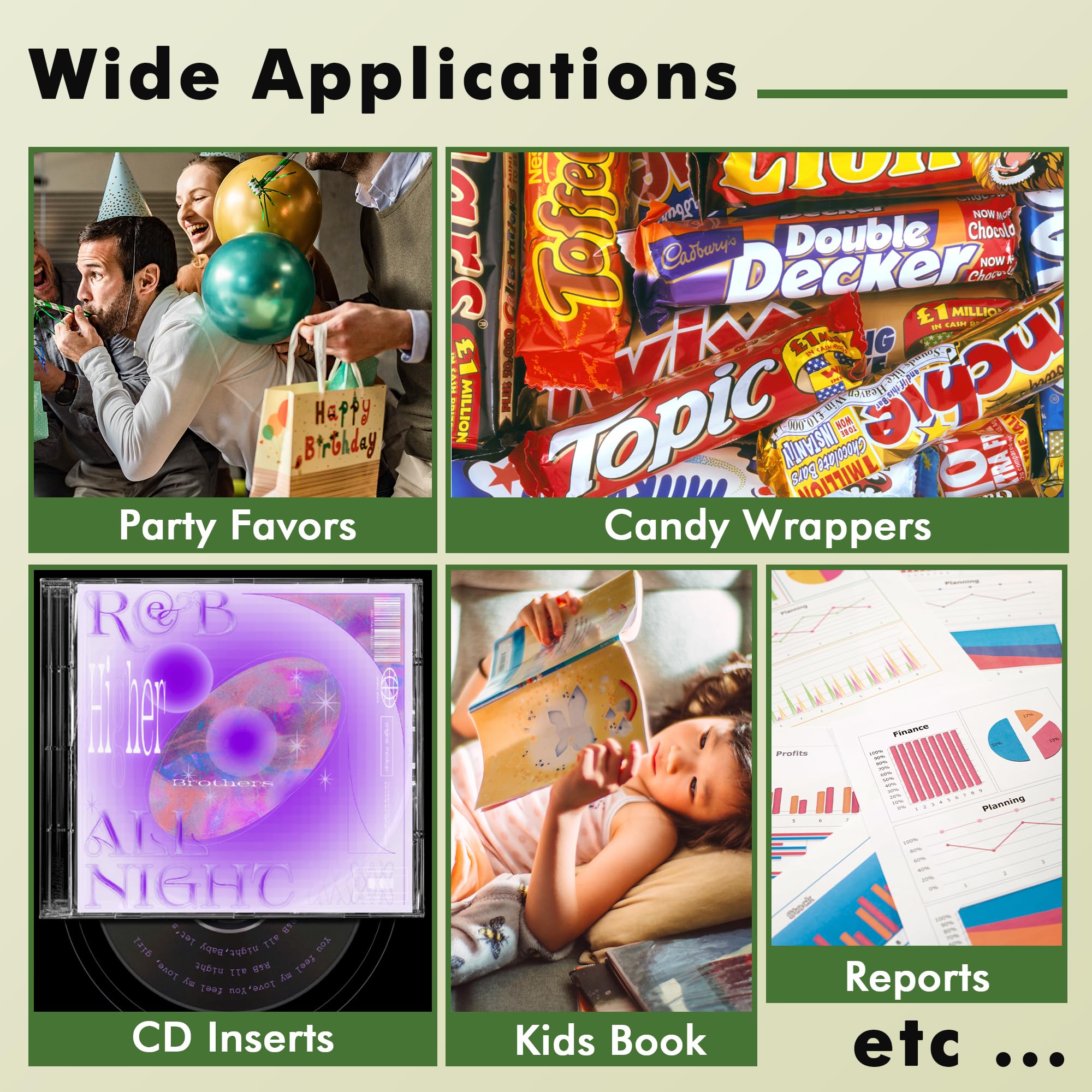 Suitable for Books, DIY Chip Bags, Party Favors, Candy Wrappers, CD Inserts, Menus, Reports, Brochures Flyers etc