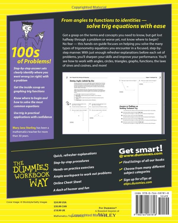 From angles to functions to identities – solve trig equations with ease Got a grasp on the terms and concepts you need to know, but get lost halfway through a problem or worse yet, not know where to begin? No fear – this hands-on-guide focuses on helping you solve the many types of trigonometry equations you encounter in a focused, step-by-step manner. With just enough refresher explanations before each set of problems, you’ll sharpen your skills and improve your performance. You’ll see how to work with angles, circles, triangles, graphs, functions, the laws of sines and cosines, and more! 100s of Problems! * Step-by-step answer sets clearly identify where you went wrong (or right) with a problem * Get the inside scoop on graphing trig functions * Know where to begin and how to solve the most common equations * Use trig in practical applications with confidence