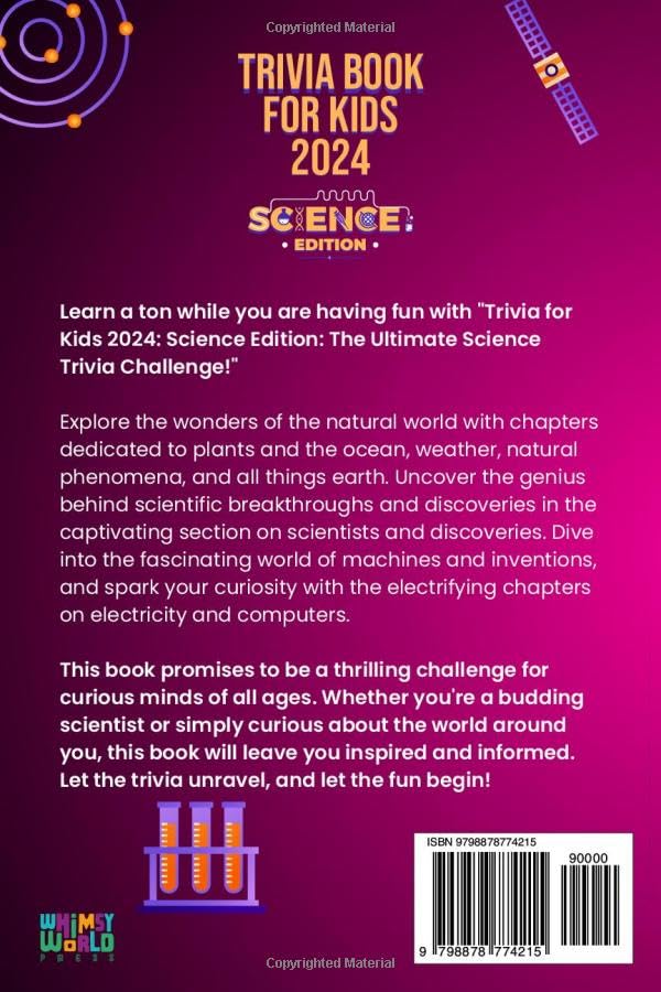 Fed up with your kids glued to screens? Discover an exciting alternative that not only entertains but subtly weaves in the joy of learning. Trivia is a great option for the whole family to spend quality time at home or on the road. “Trivia for Kids Book 2024” is freshly crafted and ready to be devoured by hungry minds, young and old. Even parents will be entertained and learn new intriguing facts! In this Science Edition, you will find five chapters with five rounds each, including true-false, multiple choice, riddles, name that song, show or movie and the infamous “would you rather.” With over 275 questions, you will learn interesting facts such as: What is the fastest-growing plant in the world? Answer: bamboo Which fruit is Isaac Newton associated with? Answer: apple Plus riddles like these: Why didn’t the girl trust the ocean? Answer: There was something fishy about it. What begins with T, ends with T, and has T in it? Answer: A teapot And Would you Rather scenarios such as: Would you rather be able to breathe underwater or be able to talk to sea creatures? Why? Would you rather have a robot butler that can do all your household chores or a time machine that lets you travel to any point in the past or future? Why? Not to mention the true and false and name that song, show or movie! This isn’t just a book, it’s a dive into the fascinating world of science! Chapters include Plants and Ocean, Weather, Natural Phenomena, and All Things Earth, Scientists and Discoveries, Machines and Inventions, and Electricity and Computers. If you are looking for the perfect boredom buster for 2024, scroll up and click “buy now” to have this book right away!