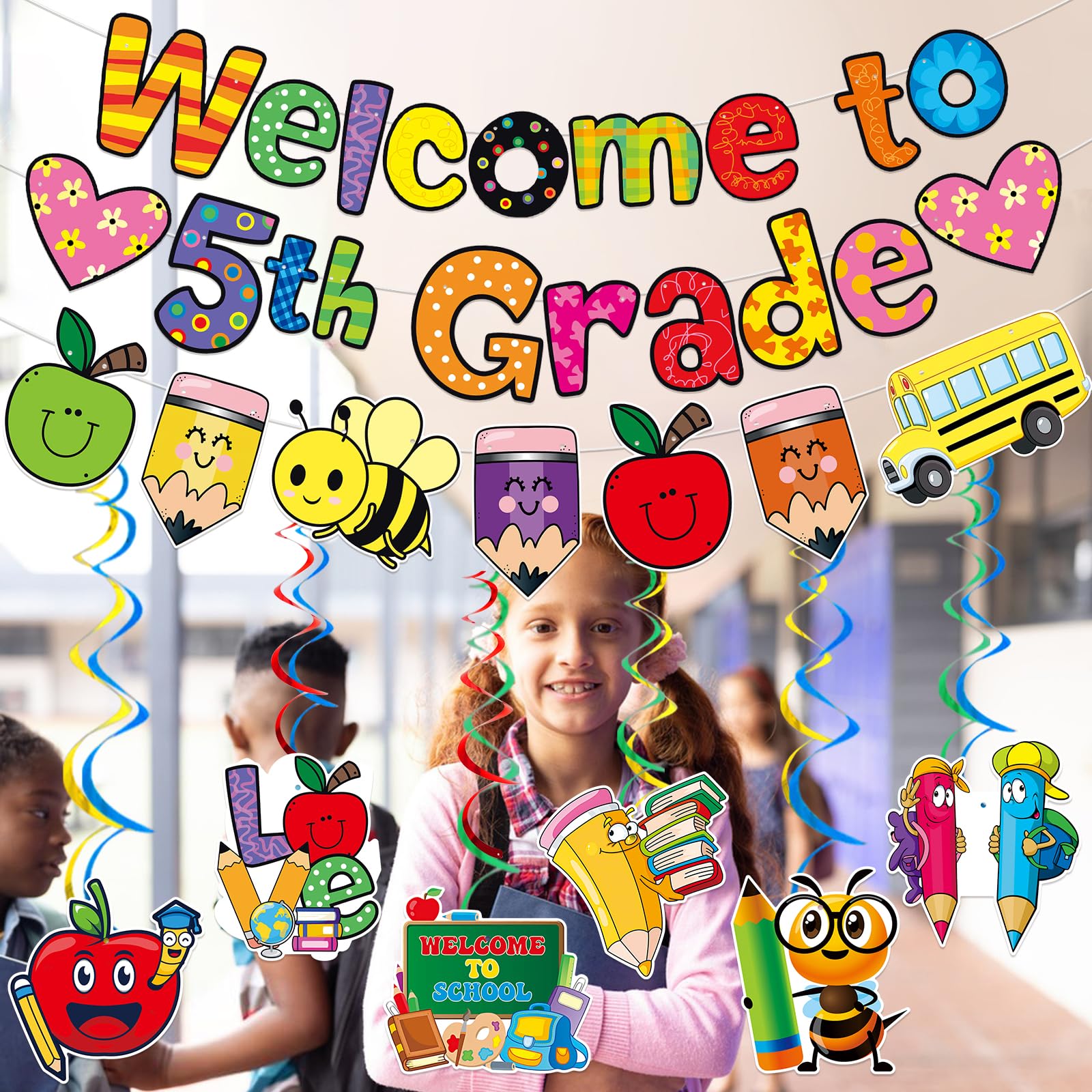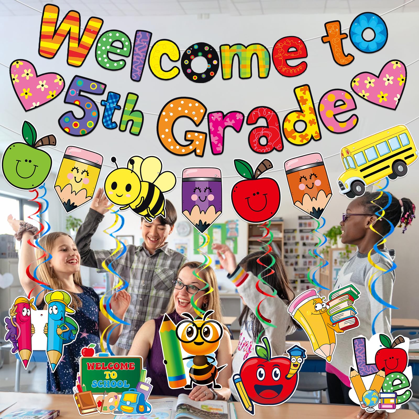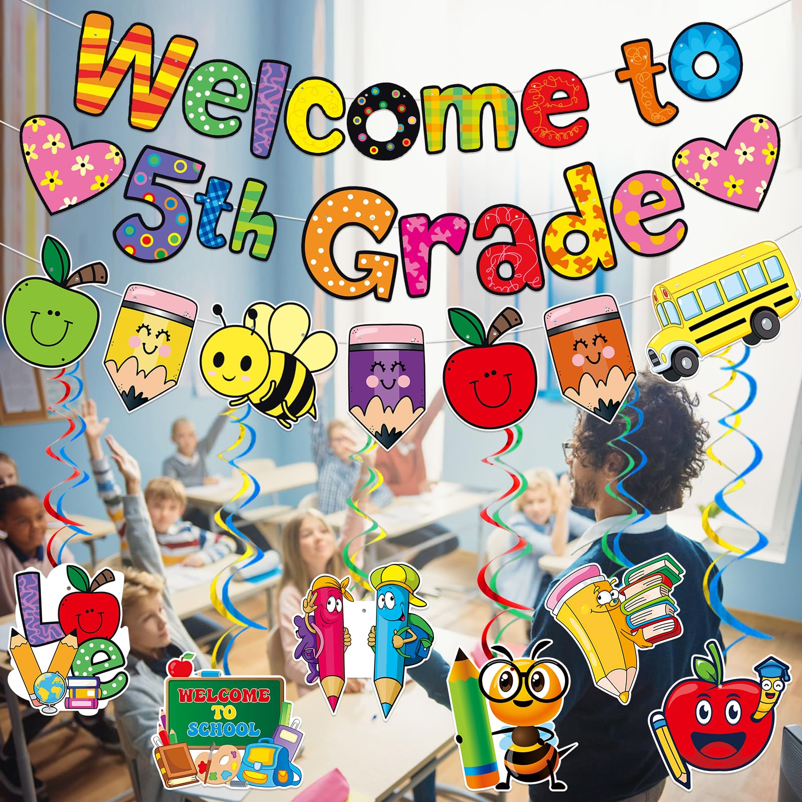 Package Include: 1*Welcome To 5th Grade Banner, 1*5th themed garland Banner, 12*back to scholl hanging decorations (6 paper cutouts in different designs; 6pcs foil hanging swirls in different colors).