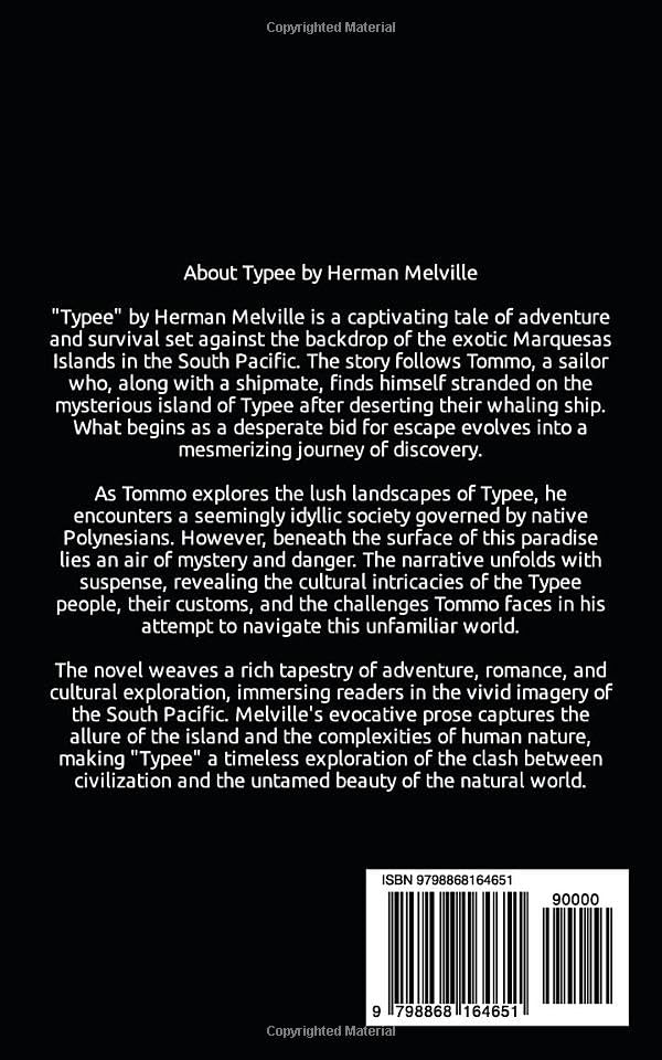 About Typee by Herman Melville “Typee” by Herman Melville is a captivating tale of adventure and survival set against the backdrop of the exotic Marquesas Islands in the South Pacific. The story follows Tommo, a sailor who, along with a shipmate, finds himself stranded on the mysterious island of Typee after deserting their whaling ship. What begins as a desperate bid for escape evolves into a mesmerizing journey of discovery. As Tommo explores the lush landscapes of Typee, he encounters a seemingly idyllic society governed by native Polynesians. However, beneath the surface of this paradise lies an air of mystery and danger. The narrative unfolds with suspense, revealing the cultural intricacies of the Typee people, their customs, and the challenges Tommo faces in his attempt to navigate this unfamiliar world. The novel weaves a rich tapestry of adventure, romance, and cultural exploration, immersing readers in the vivid imagery of the South Pacific. Melville’s evocative prose captures the allure of the island and the complexities of human nature, making “Typee” a timeless exploration of the clash between civilization and the untamed beauty of the natural world. Sneak Peak “A high degree of refinement, however, does not seem to subdue our wicked propensities so much after all; and were civilization itself to be estimated by some of its results, it would seem perhaps better for what we call the barbarous part of the world to remain unchanged.” Why Aevum Editions stunning reprint is Unique “Aevum” means “Everlasting” and at Aevum Editions Publishing we take every step possible to ensure the preservation and Original integrity of this book has been upheld to its highest standard. This means that the texts in this story are unedited and unchanged from the original authors publication, preserving its earliest form for you to enjoy. Add Typee by Herman Melville, to your reading list today and see why it has remained a book club favorite! Included in the book The Complete Original 1846 text Uniquely Designed Cover for Paperback, Hardcover, and E-books Historical Annotation Genre: Adventure, Travelogue, Romance Book Dimensions: 5x 8 Paperback Matte Cover Cream Paper