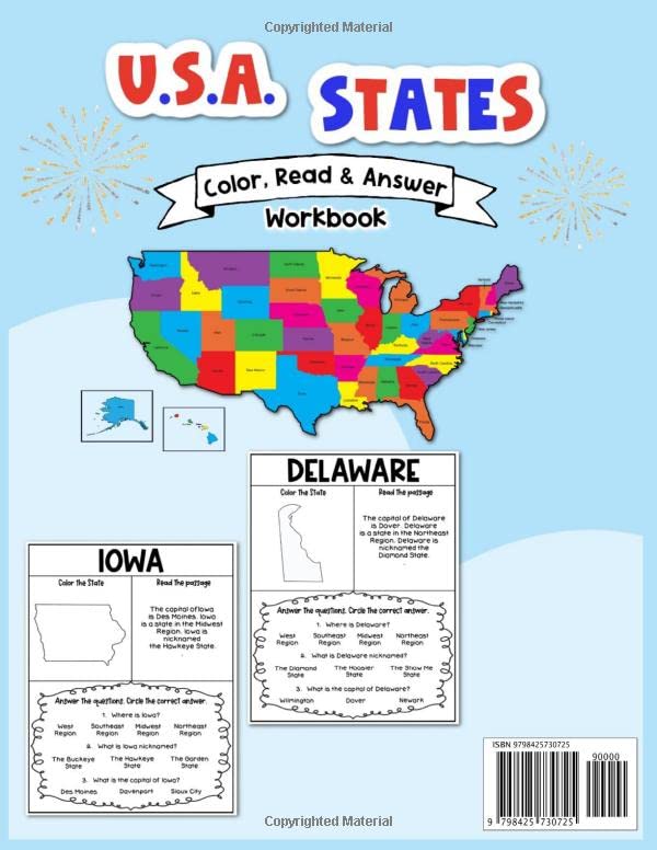 U.S.A. States Color, Read and Answer Workbook!Learn about the states with this State Workbook for kids! Each page includes the state to color, a passage to read and questions to answer by circling the correct one. The answers are in the passage! No need to research or look up anything outside of this workbook to find answers.