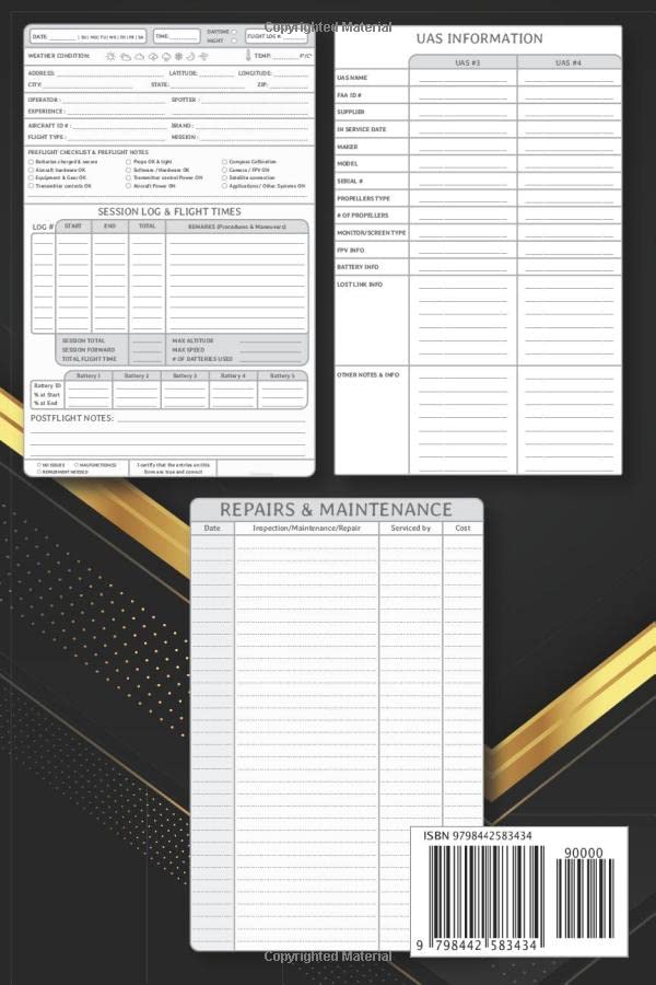 A great UAS Drone Flight Maintenance Log Book for tracking your Flights, Repairs & Maintenance! Cover : High Quality Soft Cover (Matte) Size : 6 x 9 inches (15.24 x 22.86 cm) Interior: 120 pages This Log Book is the perfect solution to keep track of your flights in one place. Why You Should Buy this Log Book : Complete UAS Drone Flight & Maintenance Log Book : The book is designed to allow you to record : * Flights: track the Flight Times, Location, Weather Condition, Aircraft & Operator Information, Preflight Checklist, Batteries & any Issues & Malfunctions. * Repairs & Maintenance Logbook: stay up-to-date on your drones’ conditions. The goal of this notebook is to keep them in one place and have them ready to use when you most need them. Build to Last : The binding on the notebook won’t disappoint as it is strong enough to last for years so the pages will remain secured and will not break loose. Useful : This simple log book can make your life much easier. In fact it saves the trouble of thinking of how to keep track of your information. Quality Cover : The cover is very appealing and professionally designed. The slick and delicate design along with the soft smooth texture of the cover can be displayed proudly anywhere you go. Perfect Size : The large blank surface of 6 x 9 inches (15.24 x 22.86 cm) is ideal for writing while the book still lays flat. Why not have a Look Inside the book (using the Look Inside feature above) to see exactly how this Log Book can fit your needs. Buy this Log Book Journal today and become fit!