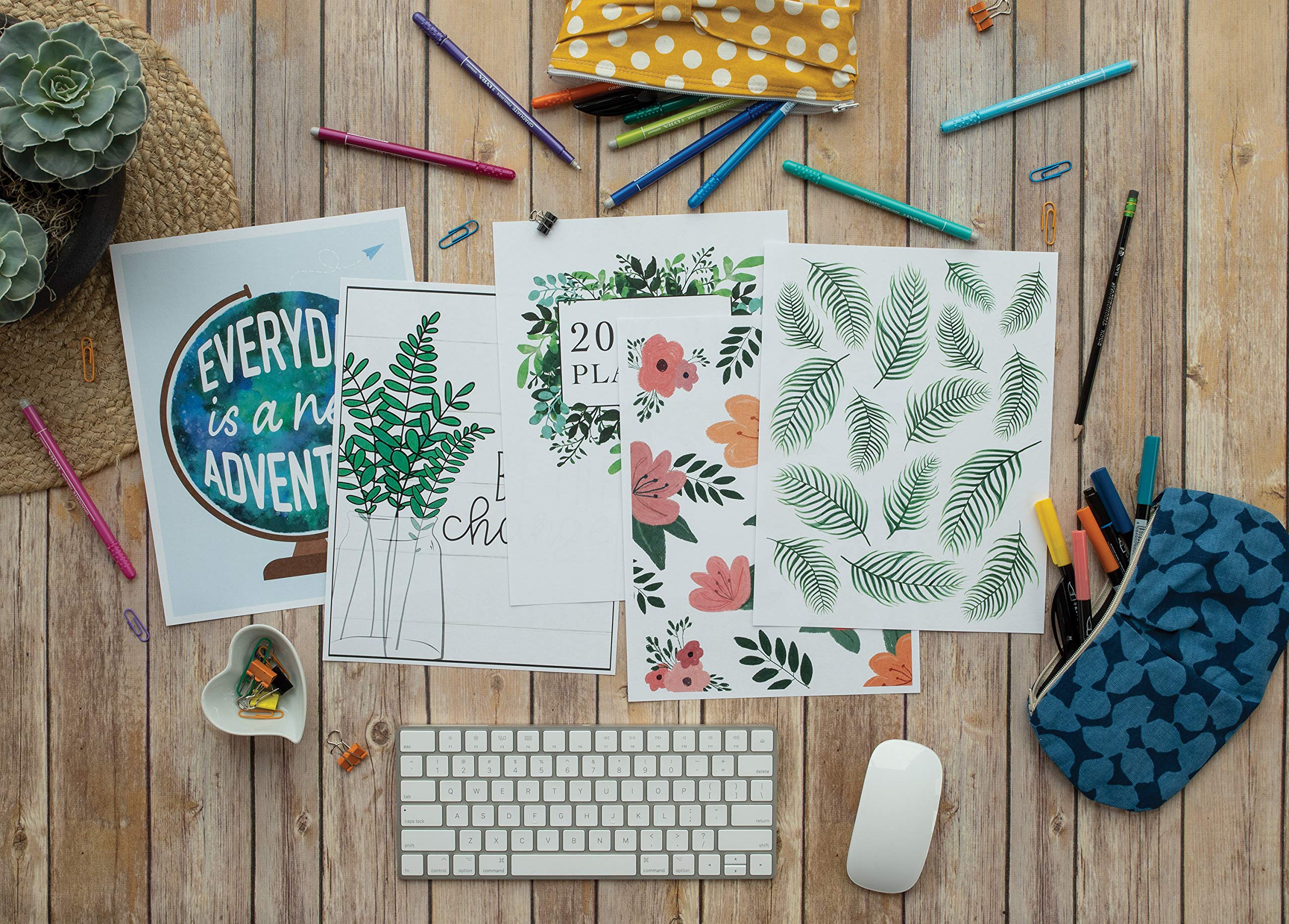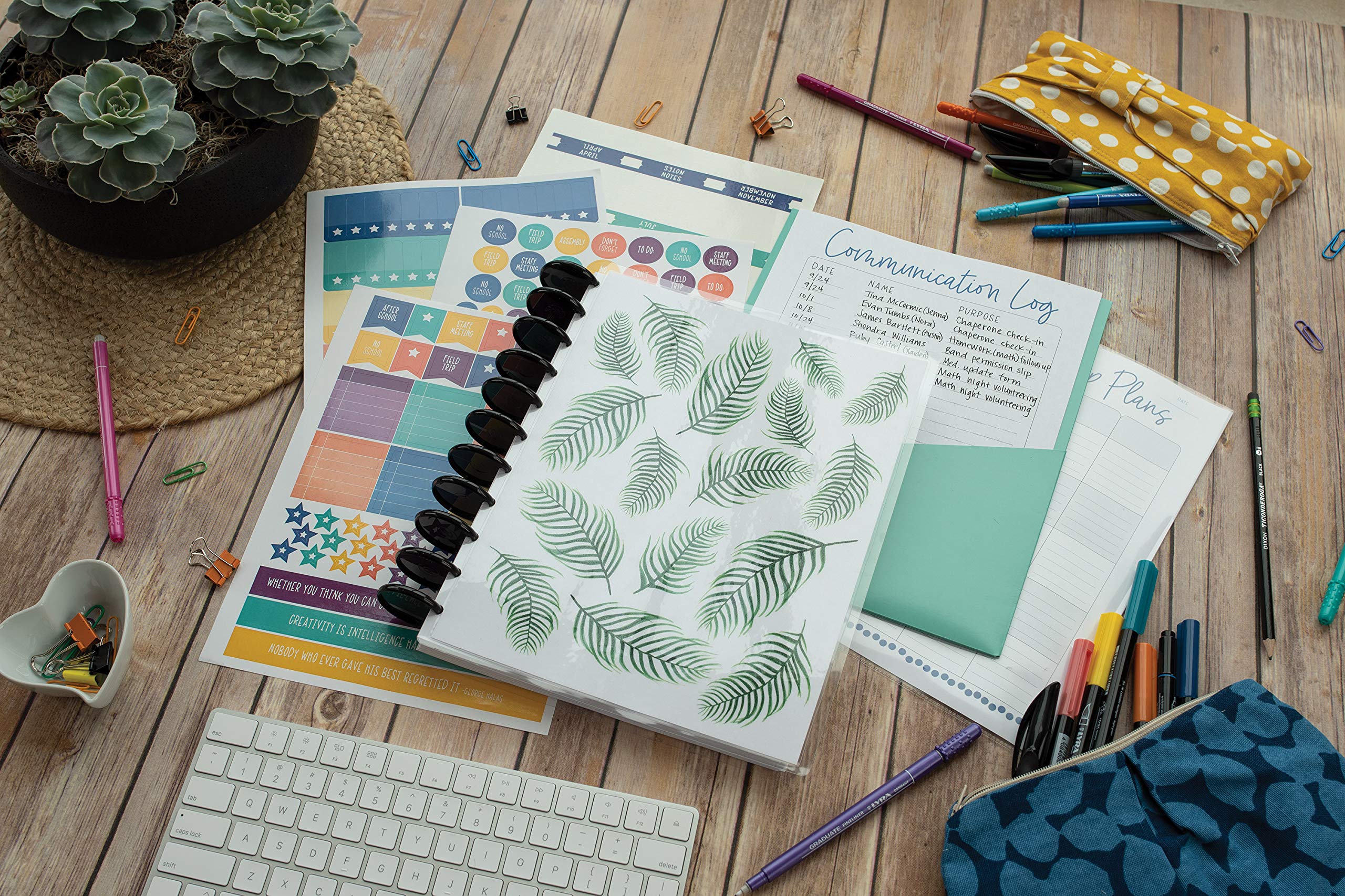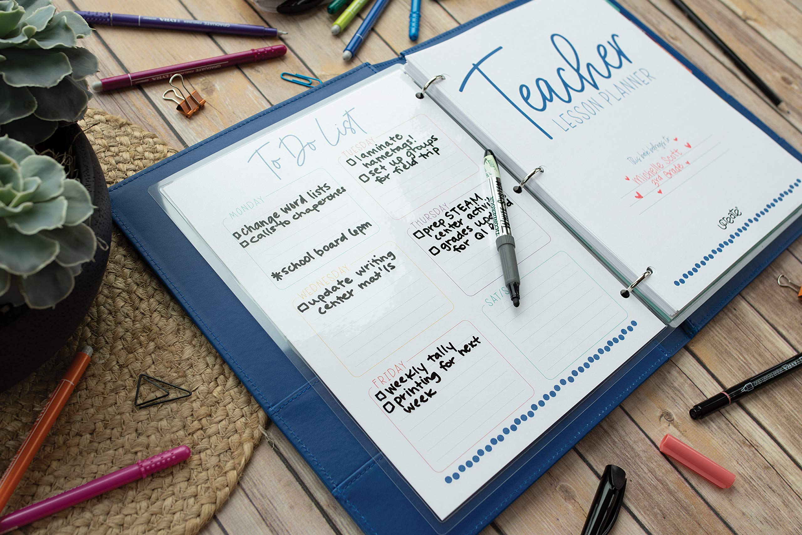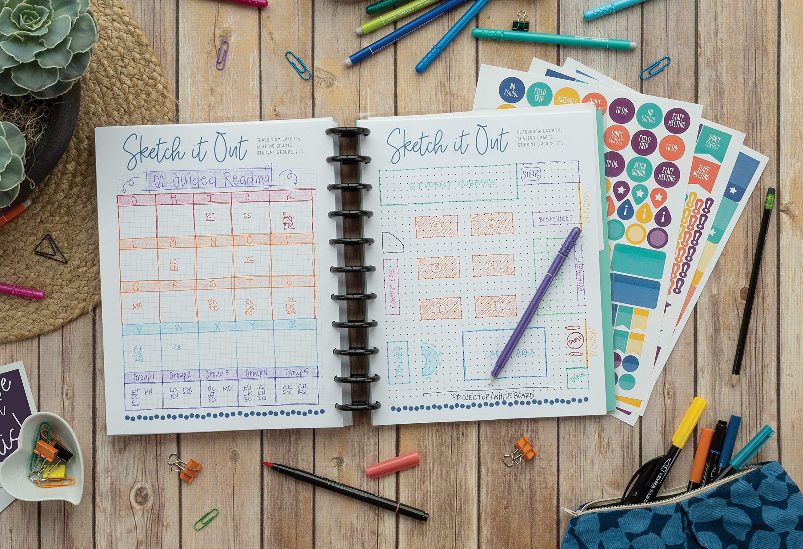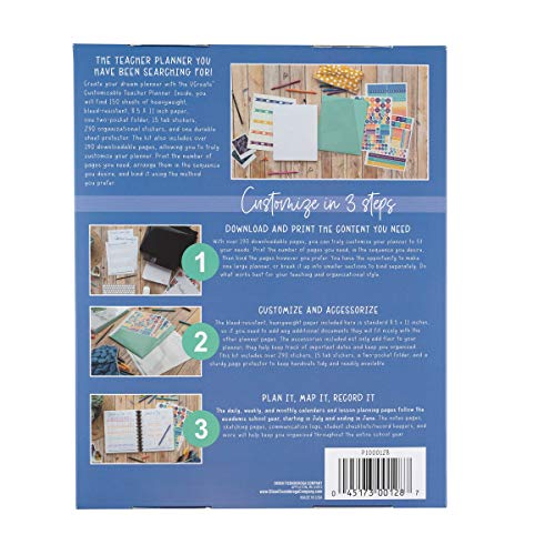 Create your dream planner with our UCreate Customizable Teacher Planner. The calendar is dated for the 2022-2023 academic year, so you can organize your whole school year in one place. The kit includes 150 sheets of bleed-resistant, heavyweight, 8.5″ x 11″ paper, one 2-pocket folder, one durable sheet protector, 15 tab stickers, and 290 organizational stickers. The kit also contains over 190 downloadable pages, allowing you to truly customize by printing the number of pages you need, in the sequence you desire, and with the binding method you prefer. With daily, weekly and monthly calendars, student checklists and record keepers, trendy cover designs and more, the UCreate Customizable Teacher planner is the perfect solution to keep you organized all school year!