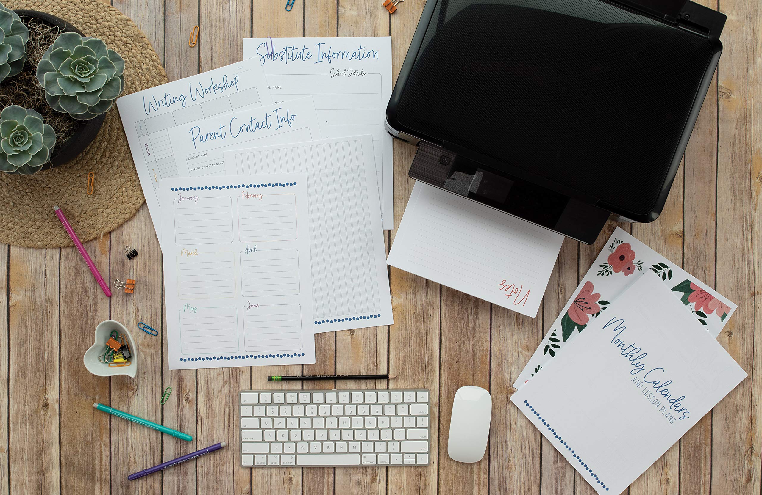- Planner templates include: student information, parent contact info, communication log, staff meeting notes, small group planning, substitute teacher information, checklists and record sheets, seating charts, and more