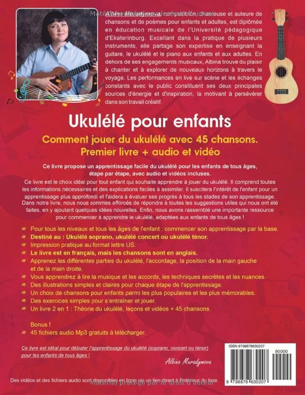 Ce livre propose un apprentissage facile du ukulele pour les enfants de tous ages, etape par etape, avec audio et videos incluses. Ce livre est le choix ideal pour tout enfant qui souhaite apprendre a jouer du ukulele. Il comprend toutes les informations necessaires et des explications faciles a assimiler. Il suscitera l’interet de l’enfant pour un apprentissage plus approfondi et l’aidera a evaluer ses progres a tous les stades de son apprentissage. Dans notre livre, nous nous sommes efforces de repondre a toutes les suggestions utiles qui nous ont ete faites, en y ajoutant quelques idees nouvelles. Enfin, nous avons rassemble une importante ressource pour commencer a apprendre le ukulele, adaptees aux enfants de tous ages ! Pour tous les niveaux et tous les ages de l’enfant : commencer son apprentissage par la base. Destine au : Ukulele soprano, ukulele concert ou ukulele tenor. Impression pratique au format lettre US. Le livre est en francais, mais les chansons sont en anglais. Apprenez les differentes parties du ukulele, l’accordage, la position de la main gauche et de la main droite. Vous apprendrez a lire la musique et les accords, les techniques secretes et les nuances. Des illustrations simples et claires pour chaque etape de l’apprentissage. Un choix de chansons pour enfants parmi les plus populaires et les plus memorables. Des exercices simples pour s’entrainer et jouer. Un livre 2 en 1 : Theorie du ukulele, lecons et videos + 45 chansons. Bonus ! 45 fichiers audio Mp3 gratuits a telecharger. Ce livre est ideal pour debuter l’apprentissage du ukulele (soprano, concert ou tenor) pour les enfants de tous ages !