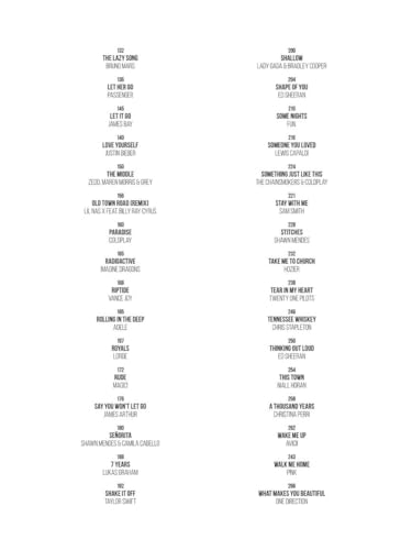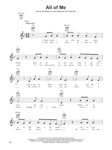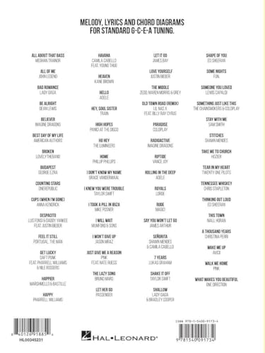 Strum and sing through the biggest pop hits of the last decade with Ukulele Sheet Music 20102019. This 272-page ukulele songbook is packed with 60 chart-topping songs, specially arranged with melody lines, lyrics, chord symbols, and chord diagrams for standard G-C-E-A tuningmaking it perfect for beginners and experienced ukulele players alike. * * Inside you’ll find massive global hits like Shallow, Despacito, Rolling in the Deep, Shape of You, and Ho Hey, all tailored for easy strumming and quick learning. With melody starters and simplified notation, players can follow along effortlessly and bring their favorite songs to lifewhether practicing solo, performing at open mic nights, or teaching students in a classroom. * * Ideal as a music teacher resource for pop-focused lessons or a thoughtful gift for pianists and ukulele players diving into contemporary music, this collection helps bridge the gap between music reading and fun, accessible play. Its layout encourages practice while supporting improvisation and performance confidence. * * Songs Included: * All of Me * Believer * Despacito * Get Lucky * Happy * Hey, Soul Sister * Ho Hey * I Will Wait * The Lazy Song * Rolling in the Deep * Shake It Off * Shallow * Stay with Me * Thinking Out Loud * Wake Me Up * and more.