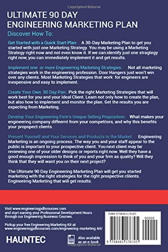 You are an experienced and respected engineer. You have an incredible engineering team. Your plans and report are well organized and accurate. Why aren’t you getting any clients? The answer is simple: Nobody knows that you even exist. Engineering marketing is about your ideal client thinking about you and your engineering company when they need and want your engineering expertise. In order to get your ideal clients to think about you you have to consistently market your engineering services. But how? You need engineering marketing skills for: Informing your ideal clients about what you have to offer Creates long-lasting clients that help to sustain the company Competing with other engineering firms who also offer similar services Building your engineering brand and then nurturing your clients relationship with that brand Leading your clients to a sale and To ultimately grow your company, and for it to flourish and to be sustainable. You’ll learn: How to quickly get a Marketing Plan Implemented Discover 10 easy and low cost engineering marketing strategies Revealed are the four phases of marketing engineering services How to set-up a 90-Day Engineering Marketing Plan Determine what sets your engineering apart from the competition Discover how your appearance can affect your marketing success And so much more… The most wonderful part is that the Ultimate 90 Day Engineering Marketing Plan might be the best kept secret in the engineering profession and Joe will show you how to get the most out of marketing your engineering services. Are you ready for success? You’ll love this comprehensive book on marketing specifically written for engineering and technical firms.The book is easy to follow and will teach you what you need to forever master the subject of engineering marketing.