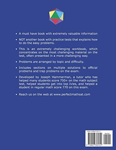 This is a must have if you are looking for a top score on the Math SAT 2 Subject Test. This is a new type of test prep book. It is much harder than the real exams and any other test prep book. It is what the author as a tutor wanted but could not find, extremely challenging and realistic practice problems for students going for top scores. It covers everything you will need to need for the exam. It is packed with problems arranged by subject and difficultly, focusing on the most challenging material and often presented in a more challenging way than on the real exam. It also includes unique sections on trap problems and multiple alternative solutions to problems from the Official Guide. The author has a Johns Hopkins math degree and is an expert tutor of the Math Subject Test, who has helped many students score 700-800 on this exam. The math was edited by the coach of a national student math Olympiad term.