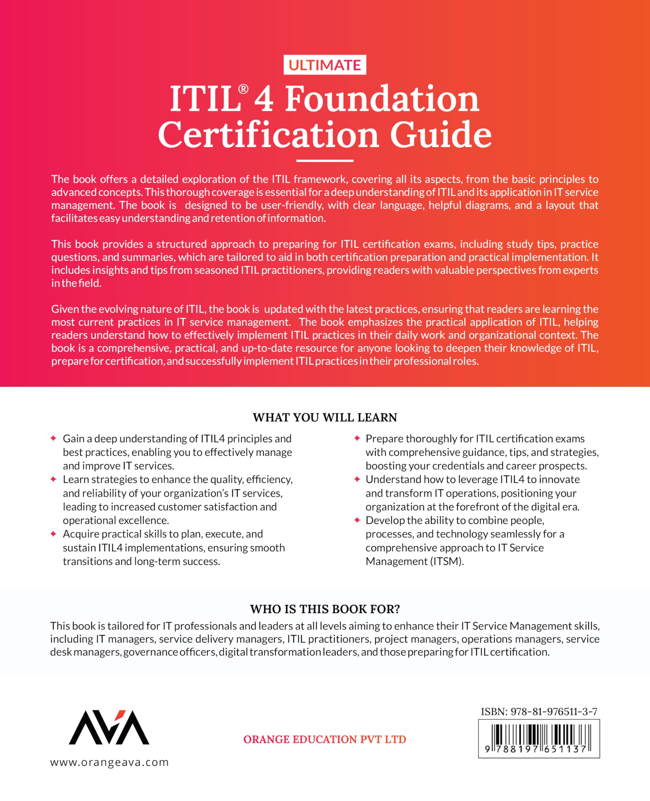 Turbo Charge Your IT career with ITSM Knowledge Book Description The book offers a detailed exploration of the ITIL framework, covering all its aspects, from the basic principles to advanced concepts. This thorough coverage is essential for a deep understanding of ITIL and its application in IT service management. The book is designed to be user-friendly, with clear language, helpful diagrams, and a layout that facilitates easy understanding and retention of information. This book provides a structured approach to preparing for ITIL certification exams, including study tips, practice questions, and summaries, which are tailored to aid in both certification preparation and practical implementation. It includes insights and tips from seasoned ITIL practitioners, providing readers with valuable perspectives from experts in the field. Given the evolving nature of ITIL, the book is updated with the latest practices, ensuring that readers are learning the most current practices in IT service management. The book emphasizes the practical application of ITIL, helping readers understand how to effectively implement ITIL practices in their daily work and organizational context. Table of Contents 1. Getting Started with ITIL and ITSM 2. Navigating the ITIL4 Landscape-1 3. Navigating the ITIL4 Landscape-2 4. A Holistic Approach to IT Service Management 5. General Management Practices – I 6. General Management Practices – II 7. General Management Practices – III 8. General Management Practices – IV 9. Technical Management Practices 10. Service Management Practices – I 11. Service Management Practices – II 12. Service Management Practices- III 13. Service Management Practices – IV 14. Service Management Practices – V 15. Roadmap for ITIL Certification 16. Digital Transformations With ITIL4 17. Implementing ITIL4 in Organizations Index