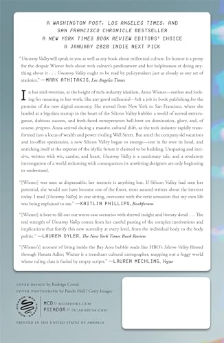 A NEW YORK TIMES BESTSELLER. ONE OF THE NEW YORK TIMES’S 10 BEST BOOKS OF 2020. Named one of the Best Books of 2020 by The Washington Post, The Atlantic, NPR, the Los Angeles Times, ELLE, Esquire, Parade, Teen Vogue, The Boston Globe, Forbes, The Times (UK), Fortune, Chicago Tribune, Glamour, The A.V. Club, Vox, Jezebel, Town & Country, OneZero, Apartment Therapy, Good Housekeeping, PopMatters, Electric Literature, Self, The Week (UK) and BookPage.A New York Times Book Review Editors’ Choice and a January 2020 IndieNext Pick. “A definitive document of a world in transition: I won’t be alone in returning to it for clarity and consolation for many years to come.” –Jia Tolentino, author of Trick Mirror: Reflections on Self-Delusion The prescient, page-turning account of a journey in Silicon Valley: a defining memoir of our digital age In her mid-twenties, at the height of tech industry idealism, Anna Wiener–stuck, broke, and looking for meaning in her work, like any good millennial–left a job in book publishing for the promise of the new digital economy. She moved from New York to San Francisco, where she landed at a big-data startup in the heart of the Silicon Valley bubble: a world of surreal extravagance, dubious success, and fresh-faced entrepreneurs hell-bent on domination, glory, and, of course, progress. Anna arrived amidst a massive cultural shift, as the tech industry rapidly transformed into a locus of wealth and power rivaling Wall Street. But amid the company ski vacations and in-office speakeasies, boyish camaraderie and ride-or-die corporate fealty, a new Silicon Valley began to emerge: one in far over its head, one that enriched itself at the expense of the idyllic future it claimed to be building. Part coming-of-age-story, part portrait of an already-bygone era, Anna Wiener’s memoir is a rare first-person glimpse into high-flying, reckless startup culture at a time of unchecked ambition, unregulated surveillance, wild fortune, and accelerating political power. With wit, candor, and heart, Anna deftly charts the tech industry’s shift from self-appointed world savior to democracy-endangering liability, alongside a personal narrative of aspiration, ambivalence, and disillusionment. Unsparing and incisive, Uncanny Valley is a cautionary tale, and a revelatory interrogation of a world reckoning with consequences its unwitting designers are only beginning to understand.