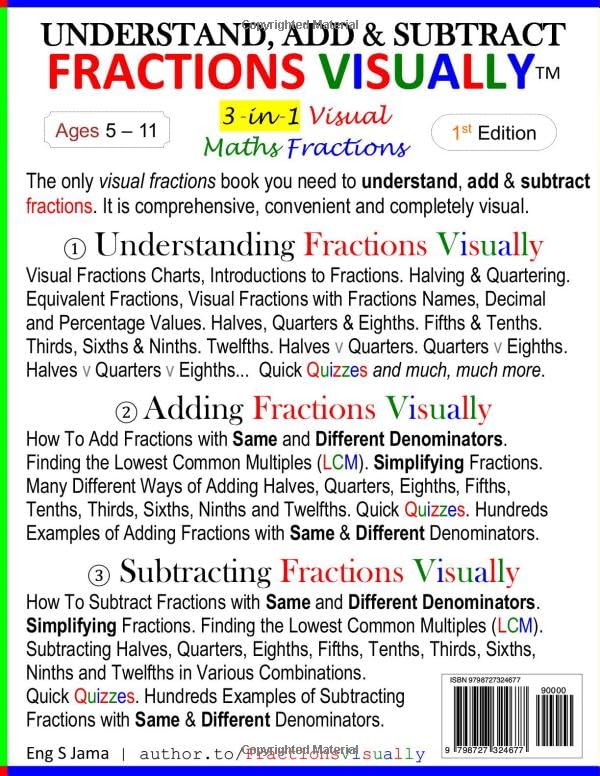 The only visual fractions book you will ever need. To UNDERSTAND, ADD & SUBTRACT fractions with same and different denominators. For Visual Learner Folks(tm) to master maths Fractions Visually(tm) in a few hours. That’s a solid promise, Not a sales pitch! It is comprehensive, convenient and completely visual. 299 pages. “Ottimo per i bambini.” “Arrivato veloce. Libro utilissimo per ripassare insieme con i piccoli a scuola. Libro molto utile, grafica fatta bene che coadiuva il processo mnemonico. .” RMagnifico — Amazon Verified Purchase 3-in-1 VISUAL MATHS FRACTIONS: 1 Understanding Fractions Visually Visual Fractions Charts Introductions to Fractions Halving and Quartering Equivalent Fractions Visual Fractions with Fractions Names, Decimal and Percentage Values Halves, Quarters, Eighths, Fifths, Tenths, Thirds, Sixths, Ninths and Twelfths Halves v Quarters. Quarters v Eighths. Halves v Quarters v Eighths… Quick Quizzes 94 pages 2 Adding Fractions Visually How To Add Fractions with Same and Different Denominators Finding the Lowest Common Multiples (LCM) Simplifying Fractions Many Different Ways of Adding Halves, Quarters, Eighths, Fifths, Tenths, Thirds, Sixths, Ninths and Twelfths Quick Quizzes Hundreds Examples of Adding Fractions with Same & Different Denominators 91 pages 3 Subtracting Fractions Visually How To Subtract Fractions with Same and Different Denominators Simplifying Fractions Finding the Lowest Common Multiples (LCM) Subtracting Halves, Quarters, Eighths, Fifths, Tenths, Thirds, Sixths, Ninths and Twelfths in Various Combinations Quick Quizzes Hundreds Examples of Subtracting Fractions with Same & Different Denominators 114 pages Total pages of book: 299. Ages 5-11, Grades Kindergarten-5th grader or Year group 1-6 in primary education (infants, elementary and junior schools). A perfect gift for a loved child, visual learner, kids with special educational needs, or someone who fails, faints or fights at text-based fractions. The author is an experienced electronics engineer turned a special educational tutor and an author of Visual Maths Fractions to pass his knowledge to other people before he dies and becomes just dust and bones! Click the Buy Now button (top right of this page) to get a copy. Also available: Colour paperback — mybook.to/B4-C SERIES: #1 — UNDERSTANDING FRACTIONS VISUALLY — mybook.to/series1 #2 — ADDING FRACTIONS VISUALLY — mybook.to/series2 #3 — ADDING FRACTIONS STEP-BY-STEP — mybook.to/series3 #4 — UNDERSTAND, ADD & SUBTRACT FRACTIONS VISUALLY — mybook.to/series4 PS; Please, don’t forget to click the Buy Now button to get your copy – today. Thanks for checking. PPS: Not sure if this is the perfect book for your child? Your purchase is automatically backed up by Amazon’s hassle-free, money back guarantee policy — the seller/author does not even have a say in it 🙂